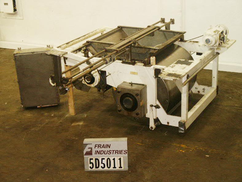 Back to All EquipmentStainless steel chilled roller mill. Equipped with (1) 36" diameter roller with 4" diameter I.D. inlet/outlet, (1) 18" diameter, fixed size infeed at 40"L x 36"W, and a pneumatic topping depositor arm. Powered by a 1 hp Dynamic motor. Unit mounted on mild steel frame. Last used to deposit carmel topping.