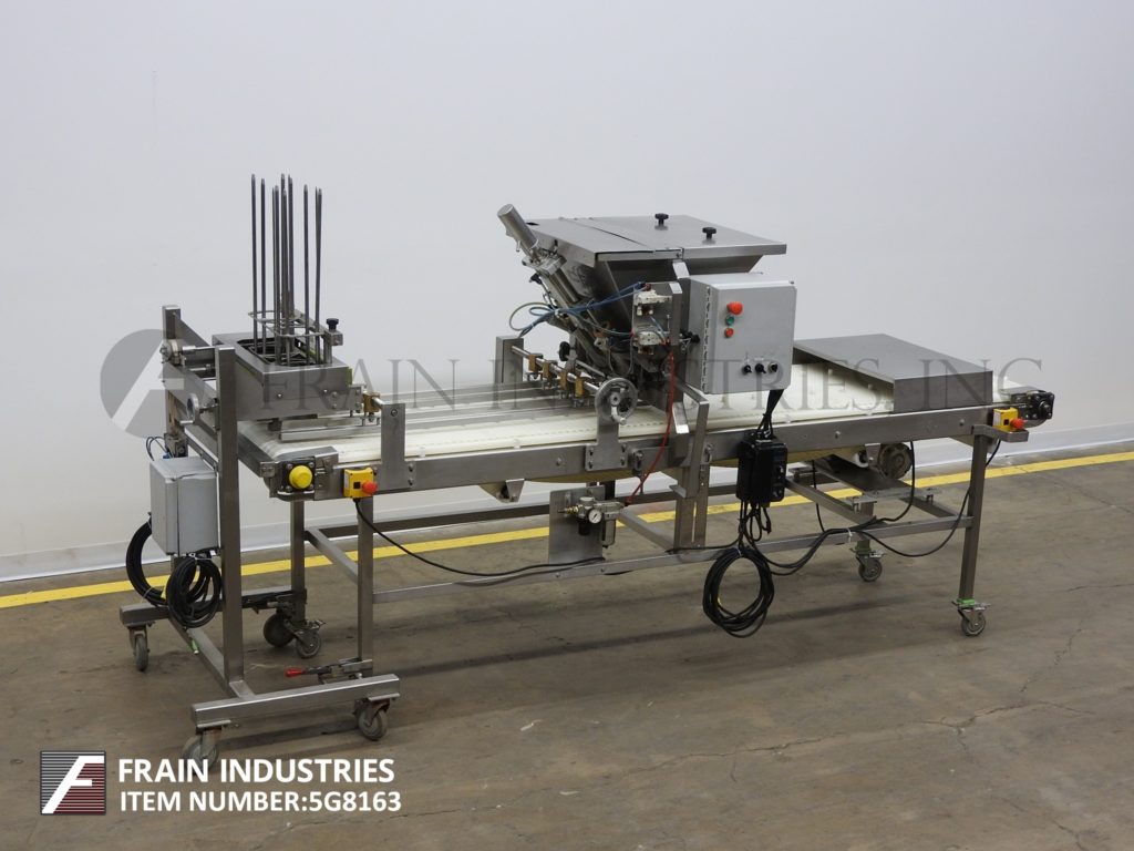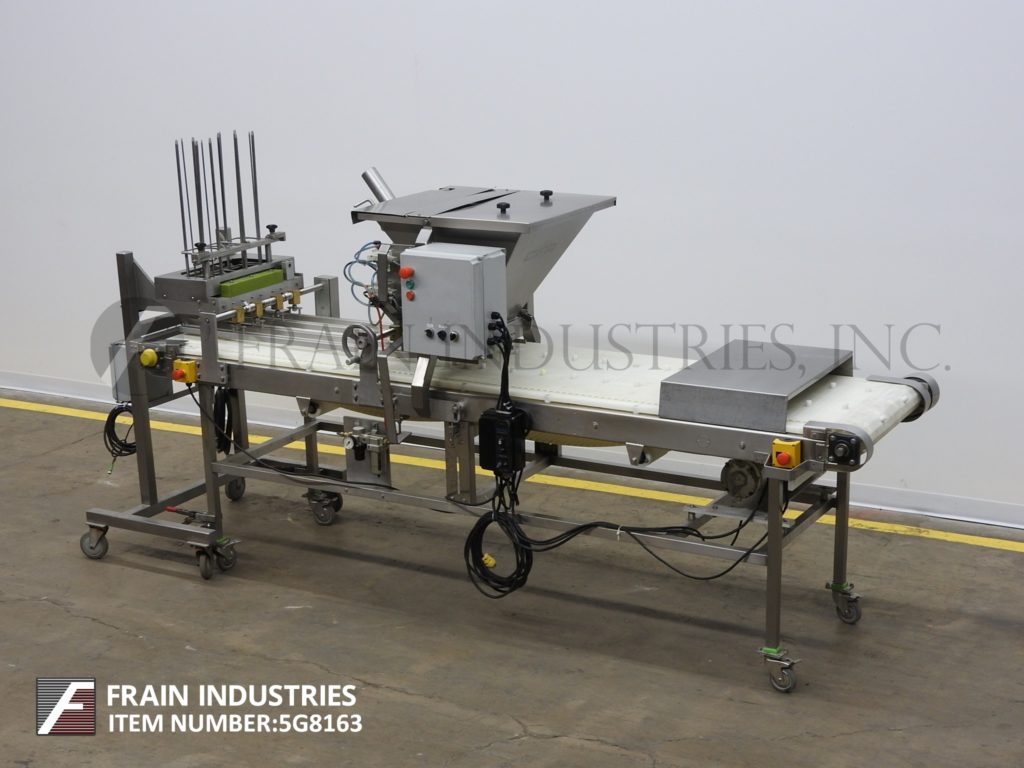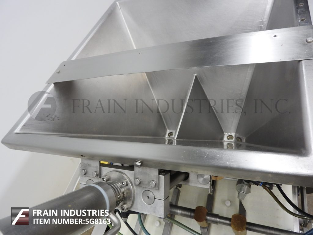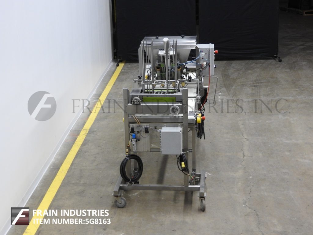 Back to All EquipmentCFR, 1 x 2, stainless steel depositor. Equipped with a 24" wide x 117" long lugged Intralox product conveyor on 5" centers, cup denester with 28" long magazine, 26" long x 24" wide x 18" deep product hopper, 1¾" diameter by 14" wide rotary valve depositing head with (2) 10oz pistons and (2) ¾" deposit openings. Includes push button start / stop, E-stop, on / off switch and variable speed conveyor.