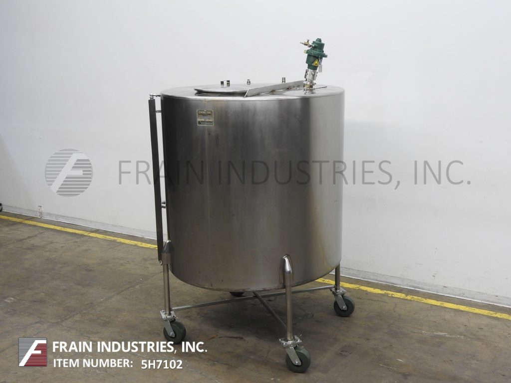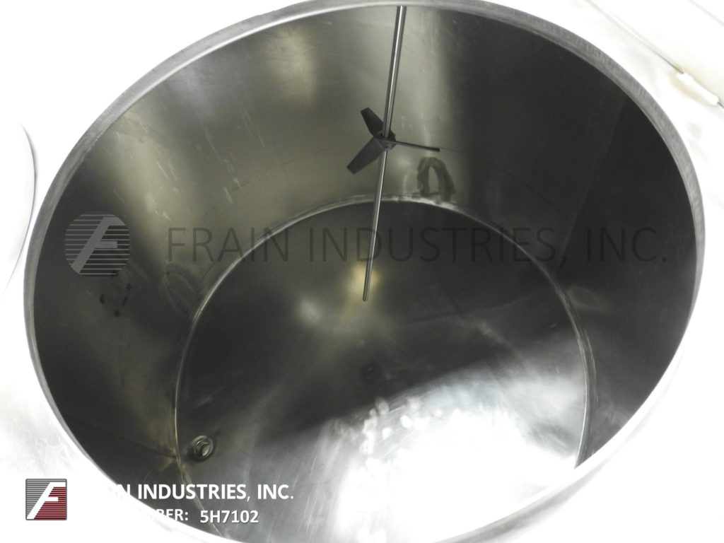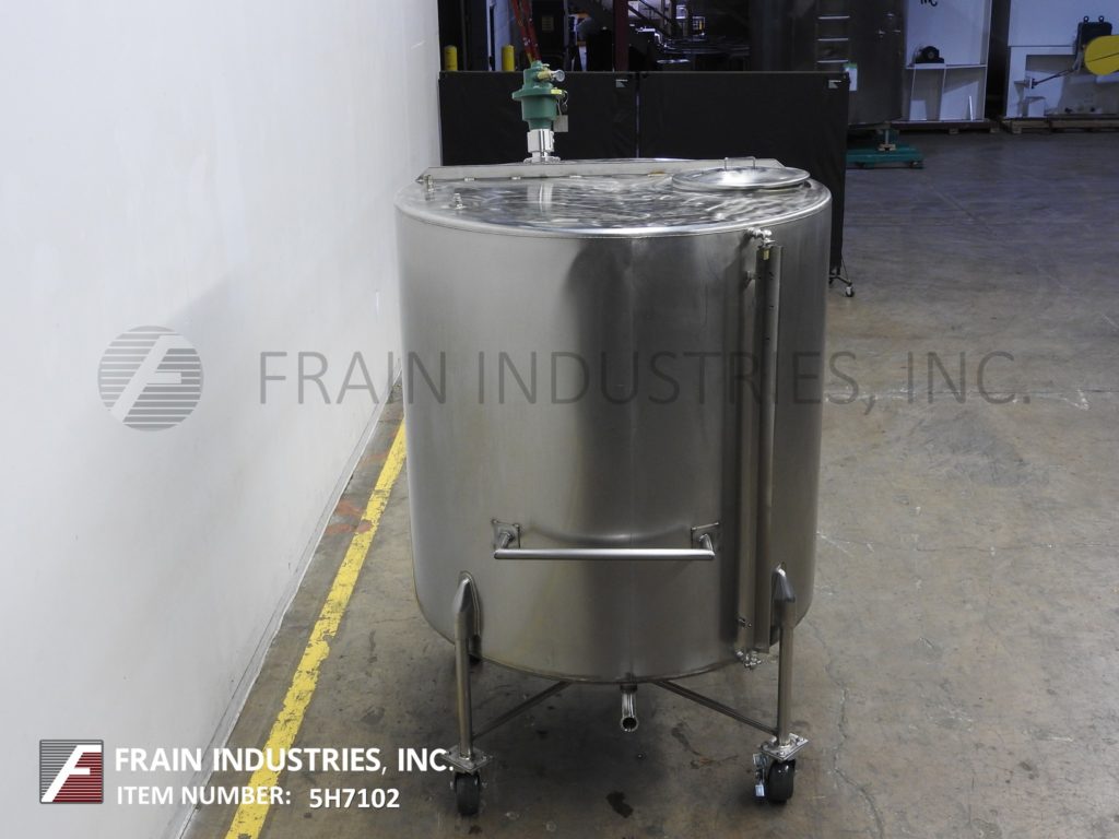 Back to All EquipmentChem Tek, 750 gallon 304 stainless steel single wall holding tank with prop style agitator. Vessel dimensions: 60" in diameter, 60" straight wall. Equipped with 18" diameter manway, top mounted pneumatic prop agitator and slant bottom with 2½"OD / 2"ID Tri-clamp discharge with 18" of ground clearance. Mounted on (4) stainless steel hip socket legs and casters.