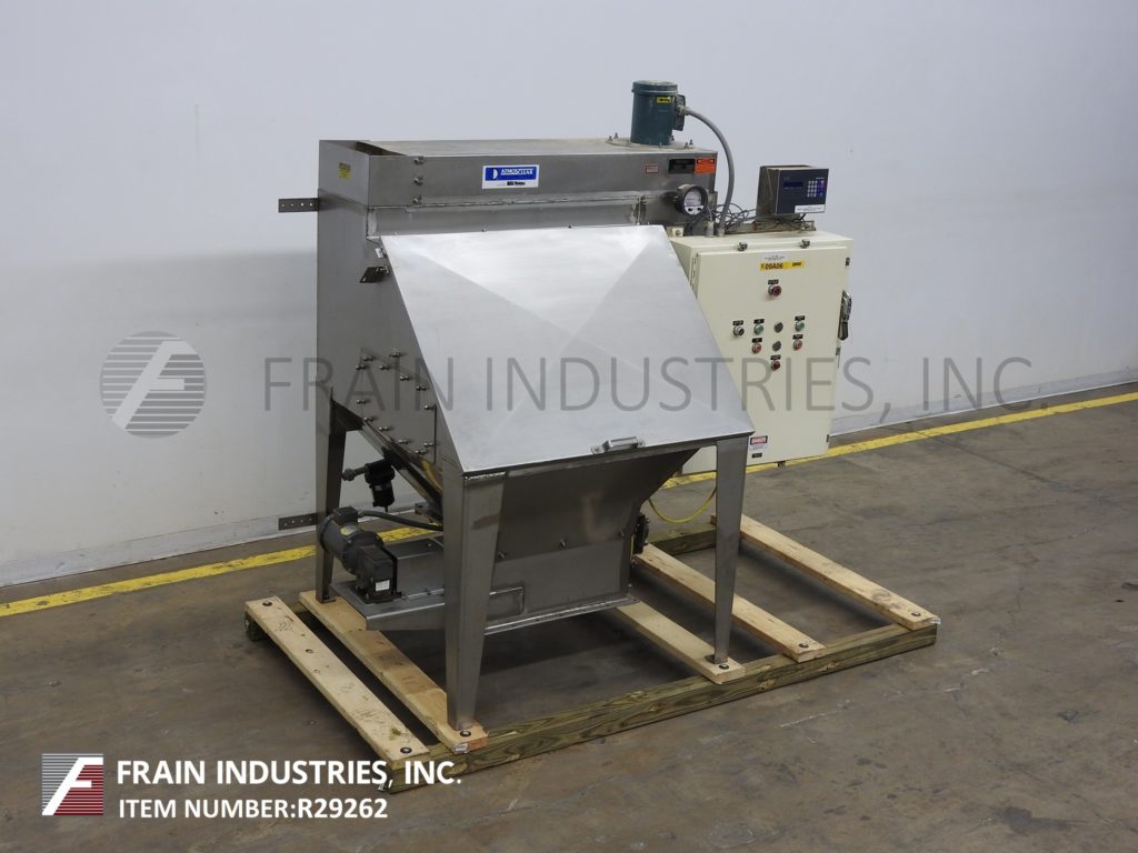 Back to All EquipmentYoung Industries Model MI-1010, stainless steel, self contained bag dump and dust collection system with pounds of product per hour – depending on materials and application. Equipped with 45" long x 36" wide product bag dump access port with flip-up cover x 30" deep pyramid shaped hopper with magnetic safety grid and bottom 7" OD product screw discharge with 3/4 Hp motor drive and onboard 8-bag dust collector with top mounted 1.5 Hp fan motor drive. Control panel has cycle timer, fan and delumper start / stop, discharge open / close switches, mixer start / stop and e-stop controls with Dayton photo helix guage. Mounted on (4) leg stainless steel base frame.