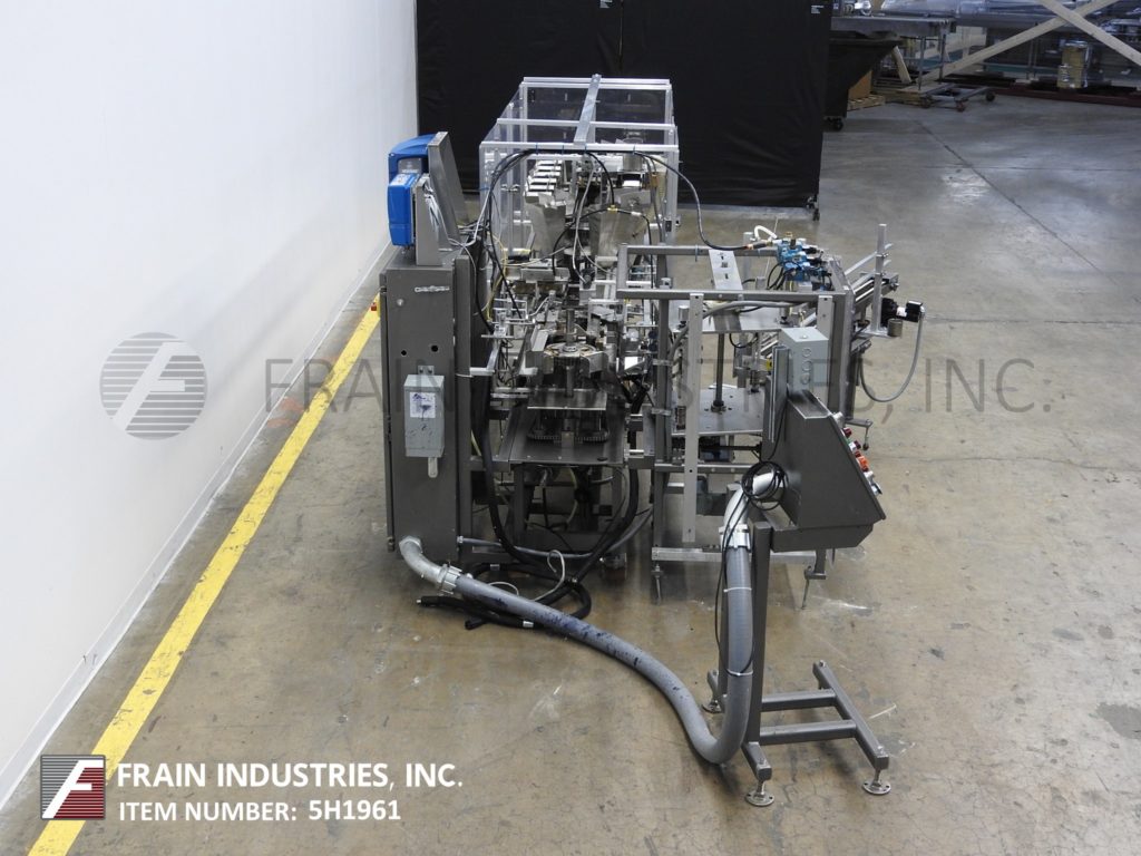 Back to All EquipmentClybourn, Automatic, continuous motion, vertical, hot melt glue cartoner with carton size and number of cartons per minute – depending on materials, application and machine configeration. Equipped with (2) chains fixed set on 7" centers with 6-1/2 long x 5-1/2 wide x 1-1/2" deep fixed product buckets and has a 72" long (2) chain powered blank carton magazine, (4) head rotary pick in place, 16 pocket rotary product funnel filling system with vibratory motors to settle product and Nordson hot melt glue system. Control panel has A/B controller, with variable speed drive and remote control panel with touch pad controls and digital readout with glue, jog, run, carton feed, vacuum, product feed, turret run, level control on, off switches and start, stop, e-stop push buttons controls. Mounted on heavy duty base frame with interlock safety guarding.