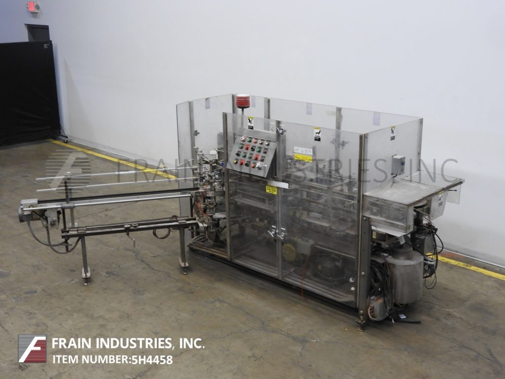 Back to All EquipmentClybourn, Model C4, automatic, vertical, 4 pocket volumetric, continuous motion, hot melt glue cartoner. Rated from 20 to 100 cartons per minute – depending on materials, application and machine configuration. Carton Size: 2" – 8¼" long x ¾" – 3¼" wide x 4¼" – 11¼" deep. Equipped with single chain currently set on 10" centers with 64" long (2) chain powered blank carton magazine, recipicating vacuum suction cup pick n place, 4½" long; 2½" wide; 3" deep fixed product buckets and (4) pocket rotary tapered product funnels and Nordson hot melt glue systyem. Control panel has drive jog, off , run and cartoner main and auto switches with vacuum, cycle, jog, reset, and start, stop, e-stop push button controls. Mounted on heavy duty base frame.