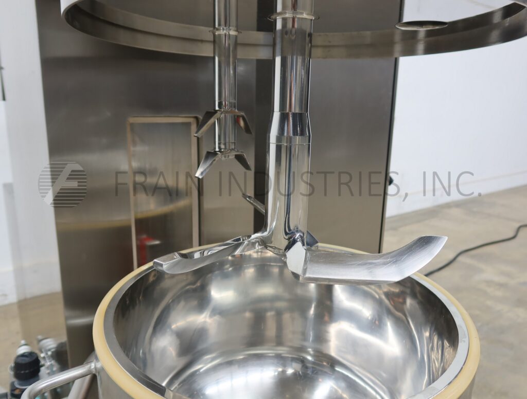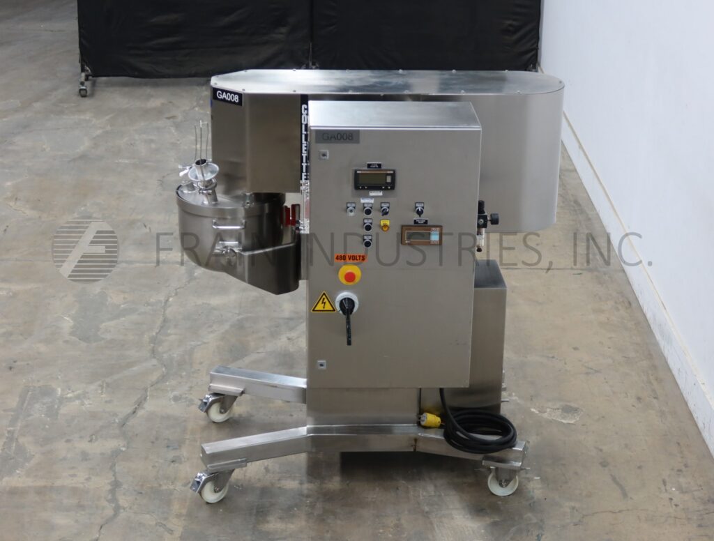 Back to All EquipmentCollette, Model GRAL 25, high speed, high shear 316L stainless steel contact parts, low pressure jacket, removable single pot granualtor. Gross capacity of 27 liters (7.13 gallons) and working capacity of 25 liters (6.6 gallons) per batch. Vessel dimensions: 14½" ID x 10" Deep. Equipped with hydraulic lift up for vessel with a fixed top cover powered by a 1 HP drive, 13" diameter (3) blade anchor style mixer with 6½" long x 1" wide blades powered by a 5 / 3.3 HP dual speed drive, (4) blade high shear mixer powered by a 2 / 1 HP dual speed drive. Control panel with high and low speed, start, stop, jog and hydraulic lift controls with pressure, rpm and temperature gauges.