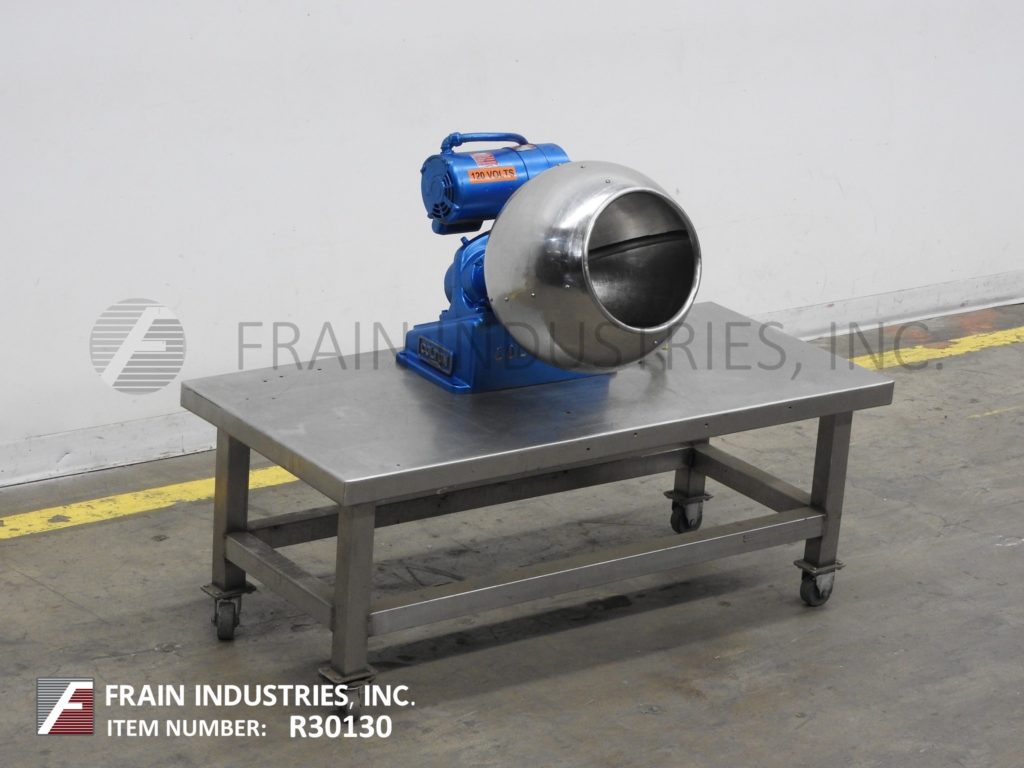 Back to All EquipmentColton 15" diameter, sphere shaped, stainless steel contact parts, table top coating pan with pounds of product per our hour – depending on materials, application and operator dexterity. Coating pan dimensions: 15" inner diameter; 16" in depth, 10" inner diameter product access port with (4) 3/4" wide x 1/2" high inner baffles and has 1/2 Hp motor drive with on / off switch. Mounted on a 35" x 30" stainless steel table.