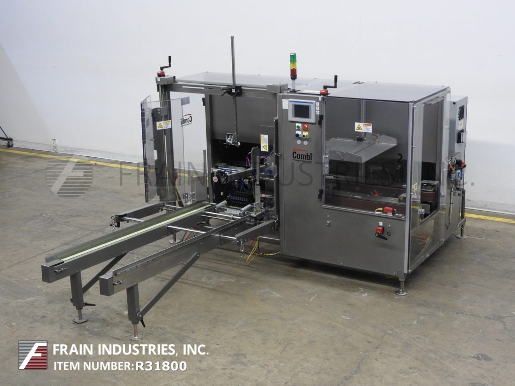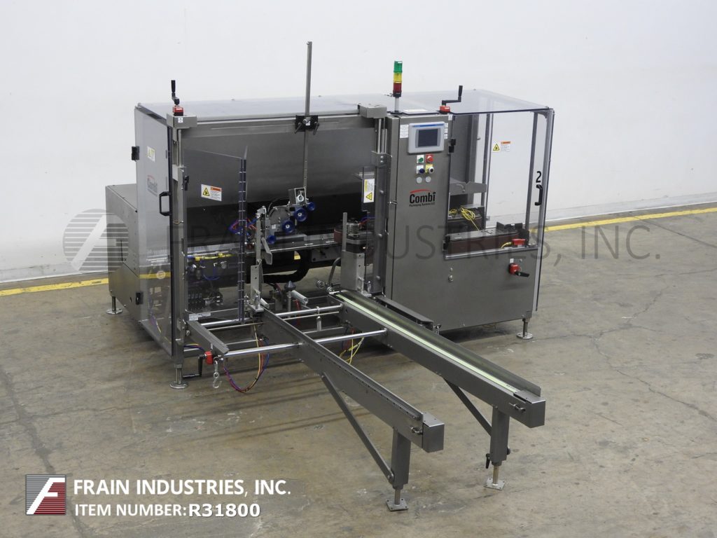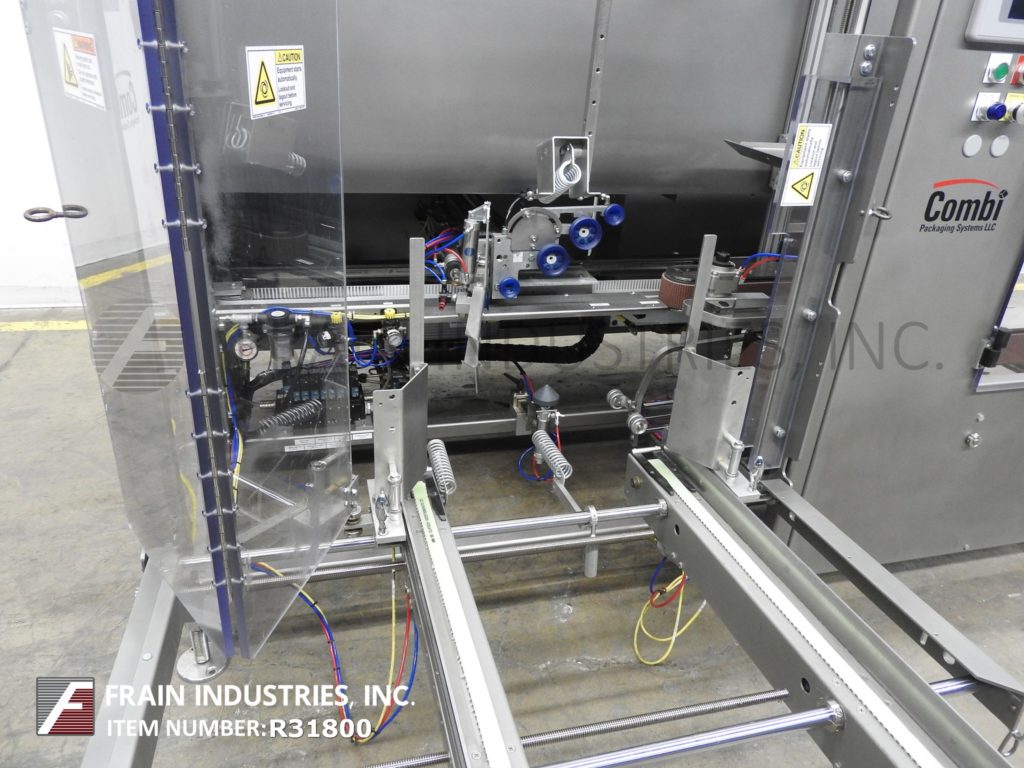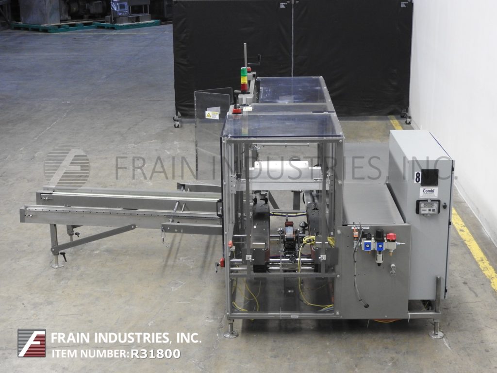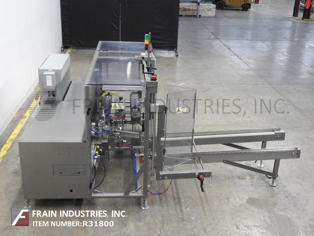 Back to All EquipmentCombi America Model 2EZHS, automatic, case erector, bottom taper rated from 5 to 20 cases per minute – depending on materials, application and operator dexterity. Case size range: 8" to 24" in Length x 6" to 16" in Width x 5" to 18" in Height. Heavy duty welded steel construction. Equipped with easy load, 80" long automatic blank case magazine, (5) suction cup pic-n-place case erector, minor and major flap closers, 44" long x 3-1/4" wide dual side belt case indexing, 3" bottom tape head, hand crank no-tool adjustable, vacuum system and interlock safety guarding. Control panel has A/B controller with A/B panel view and safety reset, start, stop and e-stop controls with ethernet interface port and statis light bar. Mounted on height adjustable frame with leveling legs.