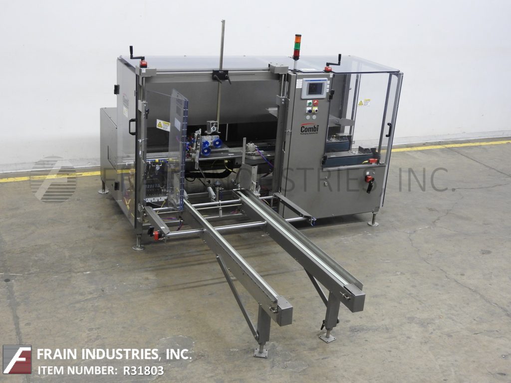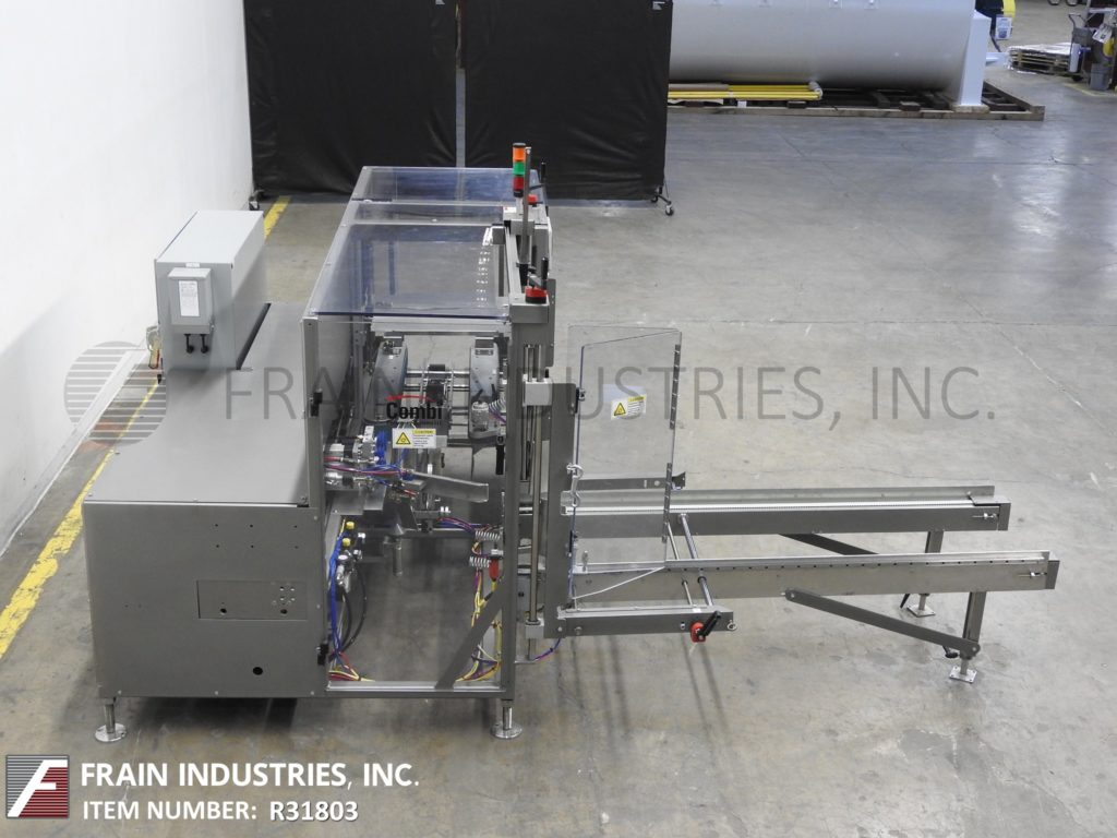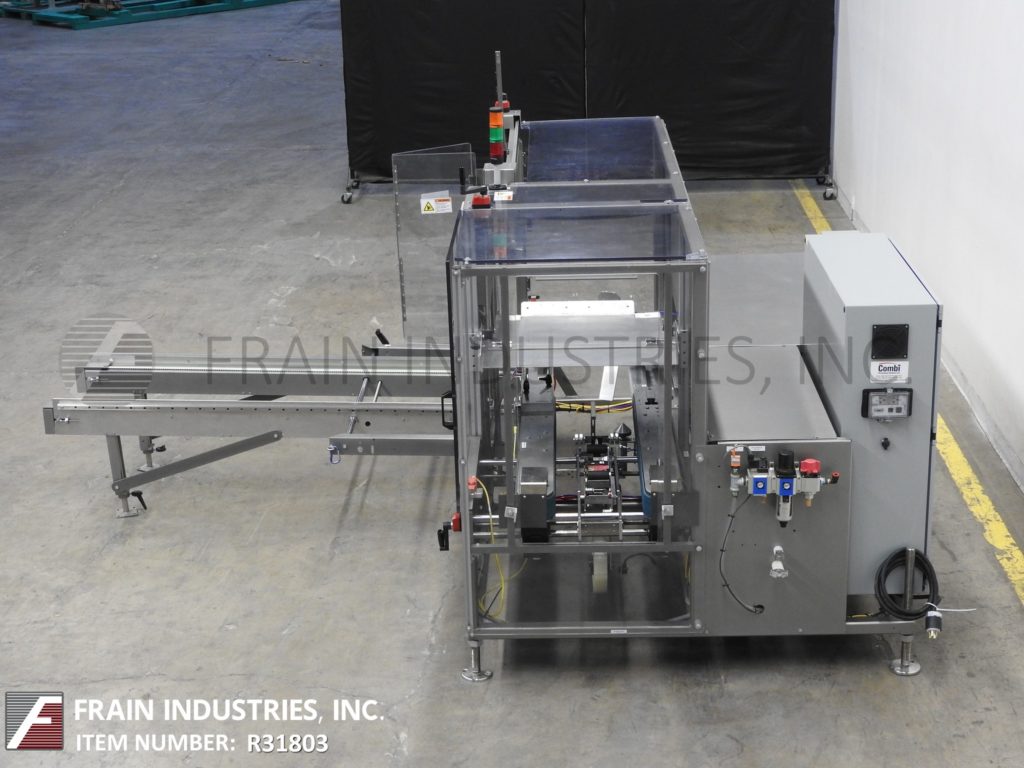 Back to All EquipmentCombi America Model 2EZHS, automatic, case erector, bottom taper rated from 5 to 20 cases per minute – depending on materials, application and operator dexterity. Case size range: 8" to 24" in Length x 6" to 16" in Width x 5" to 18" in Height. Heavy duty welded steel construction. Equipped with easy load, 80" long automatic blank case magazine, (5) suction cup pic-n-place case erector, minor and major flap closers, 44" long x 3-1/4" wide dual side belt case indexing, 3" bottom tape head, hand crank no-tool adjustable, vacuum system and interlock safety guarding. Control panel has A/B controller with A/B panel view and safety reset, start, stop and e-stop controls with ethernet interface port and statis light bar. Mounted on height adjustable frame with leveling legs.