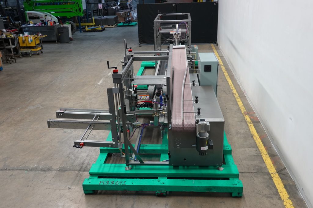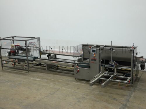 Back to All EquipmentCombi America, Model 2EZHS, Ergopack. Rated from 5 to 20 cases per minute – depending on materials, application and operator dexterity. Case size range: 8" to 24" in Length; 6" to 16" in Width; 5" to 18" in Height. Equipped with 48" long blank case magazine, suction cup reciprocating pick and place, minor and major flap closers, mech pusher bar, 2" tape head, 12" wide x 192" long product conveyor with 80" long bi-directional accumulation and packing station running parallel to 12" wide x 94" long case conveyor. Top case taper equipped with minor flap closer, major flap plows, 3" wide dual side gripper belts, 2" top / bottom tape heads, hand crank adjustable with Siko gages and interlocking Lexan safety guarding.