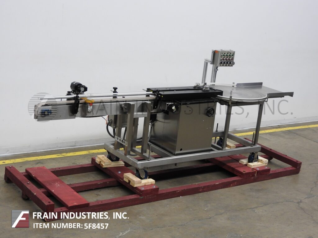 Back to All EquipmentControl Print Model 400Tran, Inline side belt transport system rated from 50 to 250 containers per minute – depending on materials and application Container size range: 1" to 7" in Length; 1" to 7" in Width; 1" to 12" in Height. Equipped with 36" in diameter disc unscrambler with 20" long x 22-3/4" wide product unload platform, 36" long container side transport conveyor with dual 36" long x 1" wide side conveyor belts, to a 36" long x 2-1/2" wide conveyor section with spacing wheels. Control panel has turntable, transport, conveyor and space wheel on / off buttons with speed control dials and e-stopand mounted on stainless steel base frame with casters and screw legs