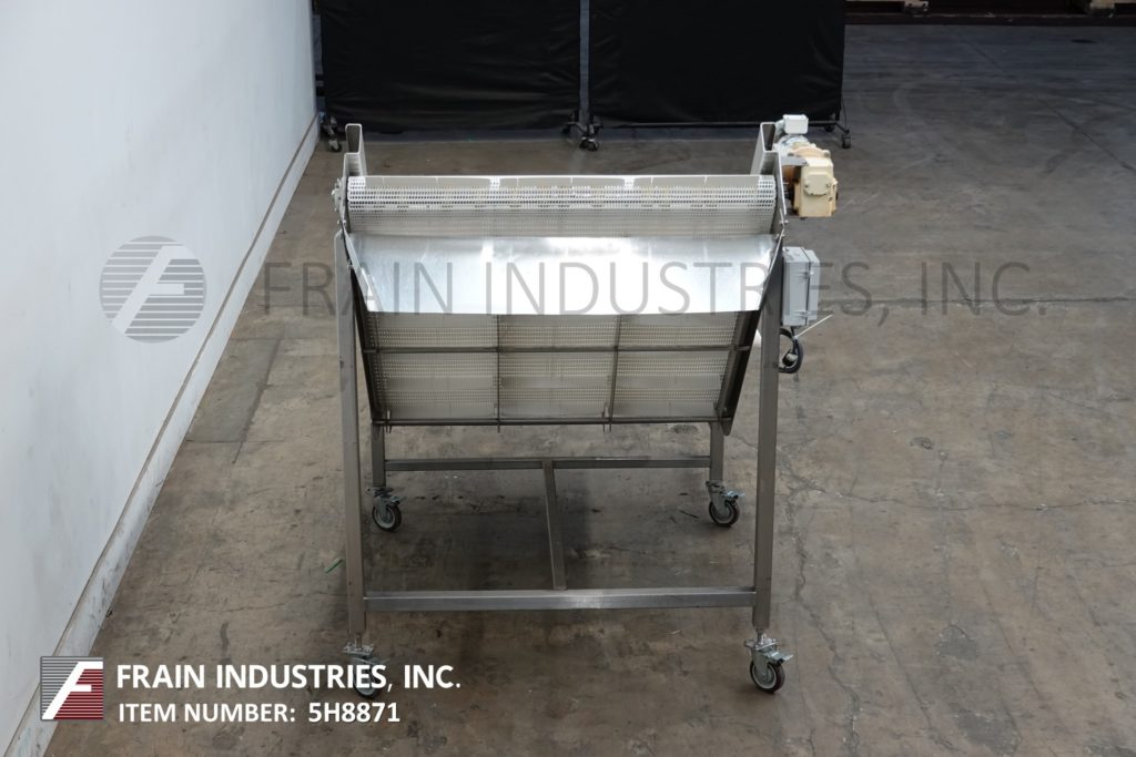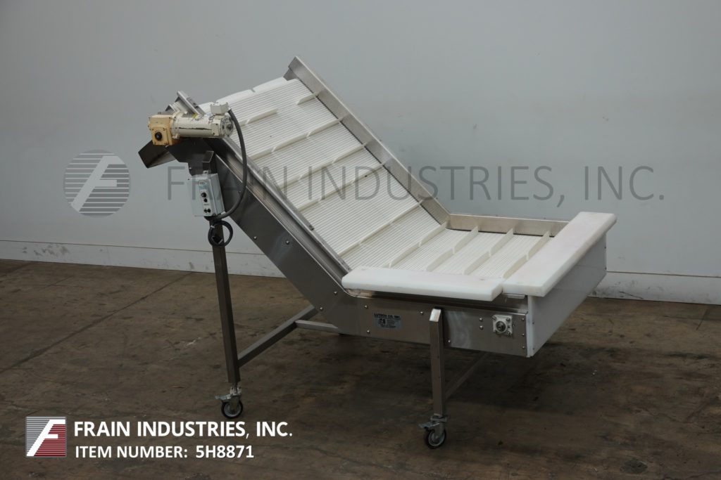 Back to All EquipmentStainless steel inclined cleated conveyor with amount of product per hour – depending on materials and application. Equipped with 48" wide x 88" long Intralox belt with 2" high cleats set on 9" centers. 23" in feed height and 42" wide discharge chute with 47" ground clearance. Top mounted ½ Hp motor drive with variable speed controller. Mounted on stainless steel frame with casters.