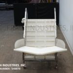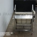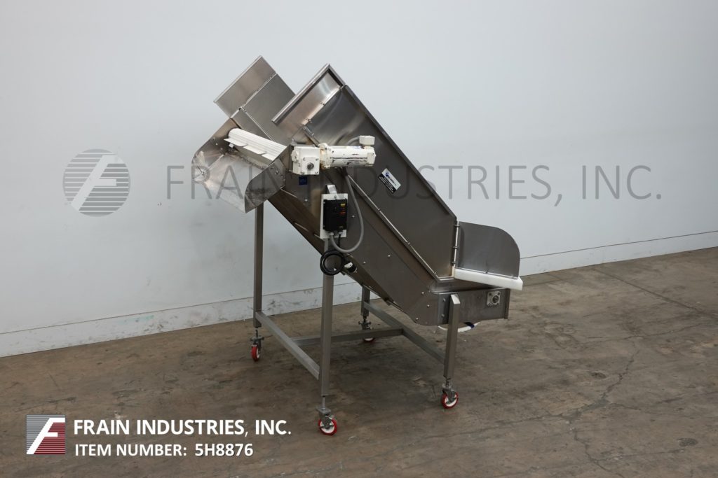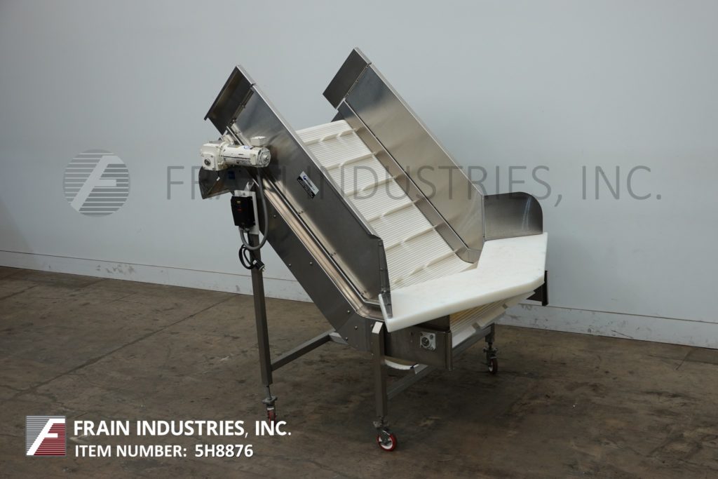 Back to All EquipmentStainless steel inclined cleated conveyor with amount of product per hour – depending on materials and application. Equipped with 47" wide x 72" long Intralox belt with 2" high cleats set on 9" centers. 23" in feed height and 45" wide discharge chute with 44" ground clearance. Top mounted ½ Hp motor drive with variable speed controller. Mounted on stainless steel frame with casters.