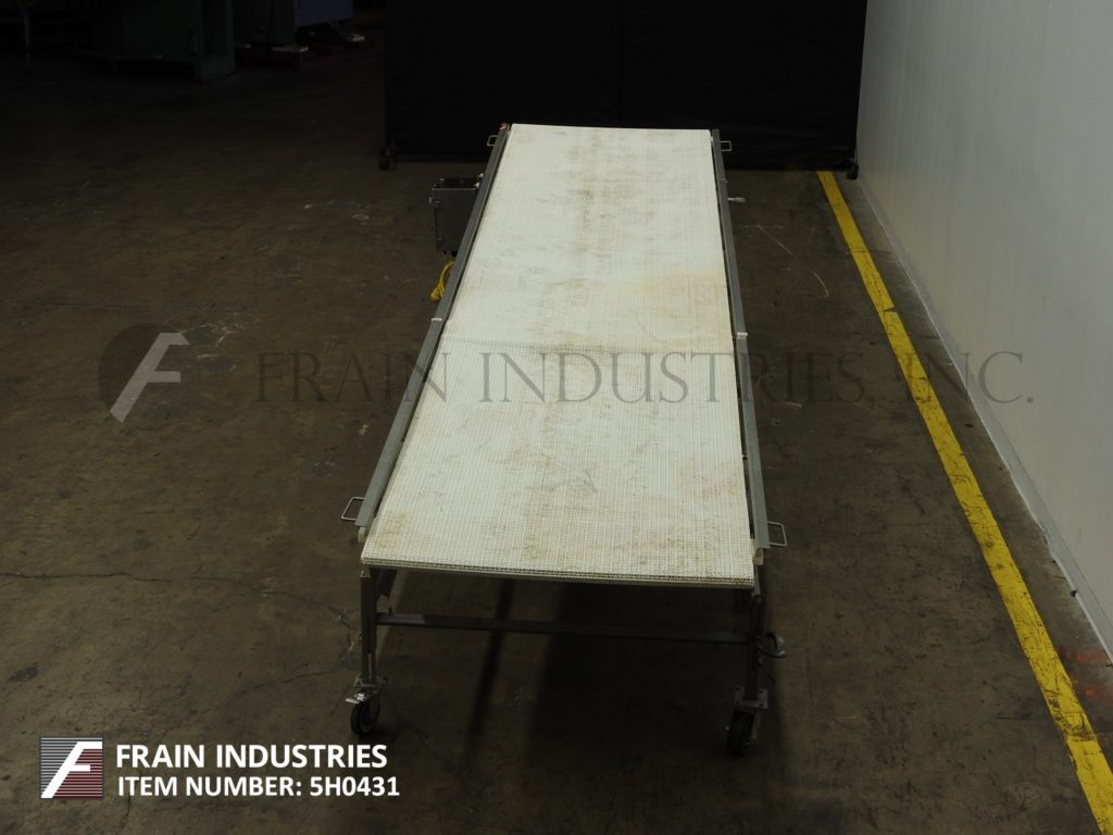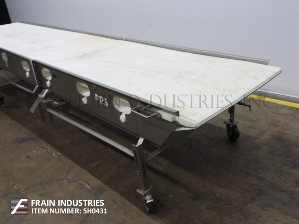 Back to All EquipmentFood Process Systems, Model 6000, 41¾" wide x 200" long stainless steel table top conveyor. 41¾" wide and 200" long Intralox style belt has an infeed range of 26" to 34" and discharge range of 36" to 44". Equipped with a (5) nozzle under belt spray bar supplied by (1) ¾" NPT fitting, ½ Hp drive with variable speed dial, push button start / stop and mounted on casters.