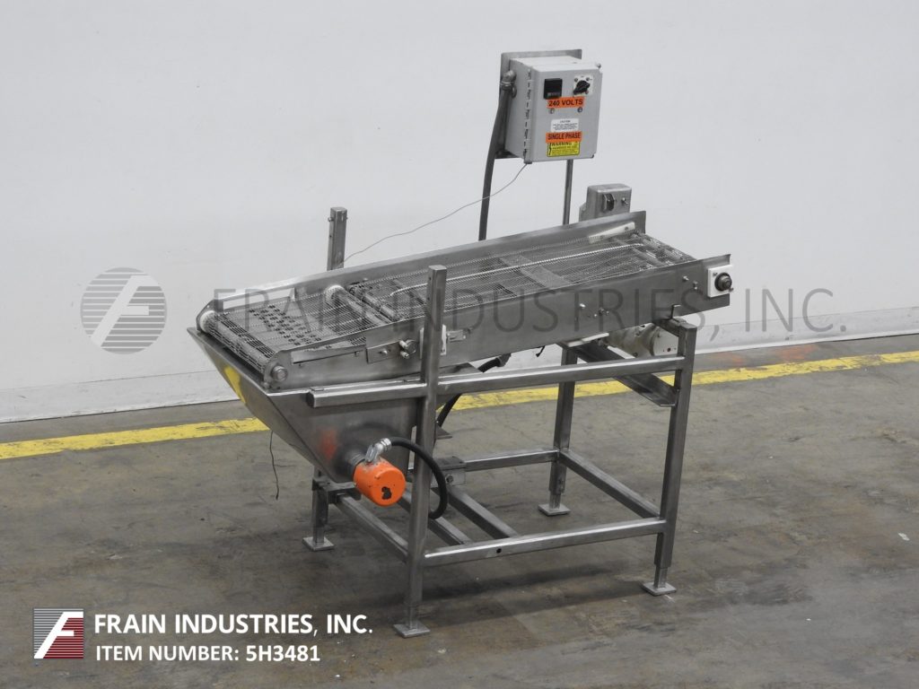 Back to All EquipmentStainless steel wire belt conveyor with heated chocolate collection bin. Equipped with a 16" wide x 16" long infeed conveyor mounted above a 19" wide x 20" long x 7" deep heated chocolate collection bin with a 2"OD / 1½"ID seated bevel port and a 16" wide x 36" long dischargeing conveyor. Control panel with digital temperature control and on / off switch.