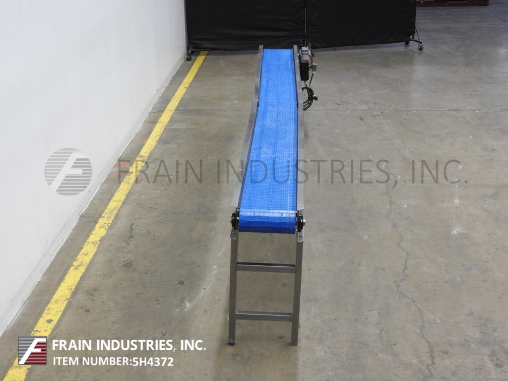 Back to All EquipmentStainless steel, table top conveyor. Equipped with a 12" wide x 188" long Intralox belt powered by a ½ Hp drive, on/off switch, VFD and mounted on (6) leveling legs with an infeed / discharge range of 34" to 38".