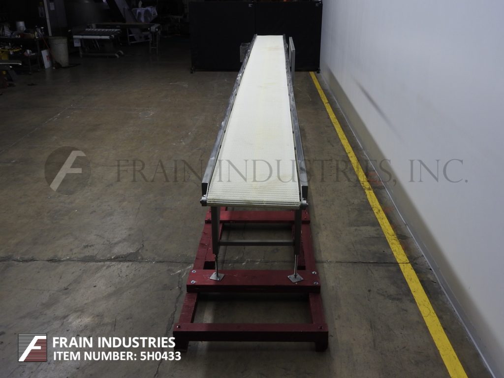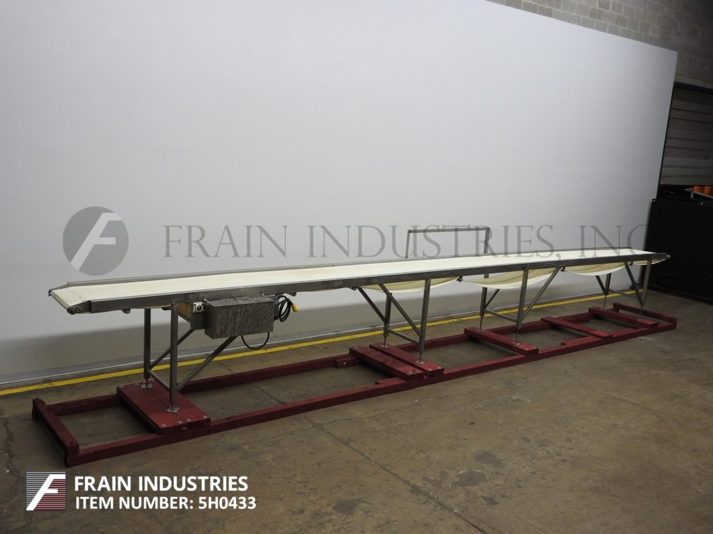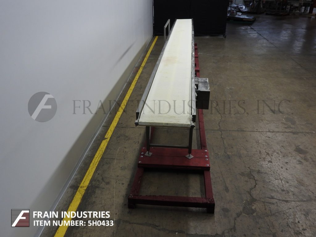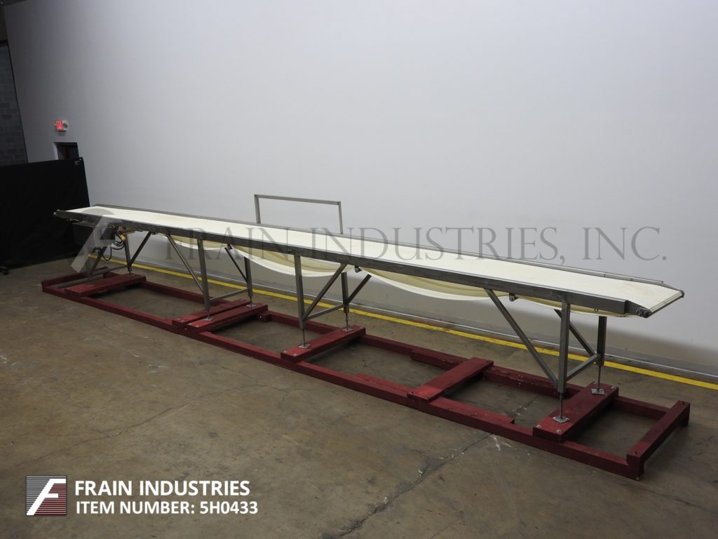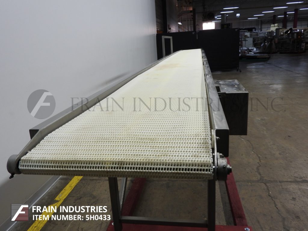 Back to All Equipment24" wide x 370" long stainless steel table top conveyor. 24" wide and 370" long Intralox style belt has an infeed / discharge range of 40" to 45". Equipped with a 1 Hp drive and mounted on (8) leveling legs.