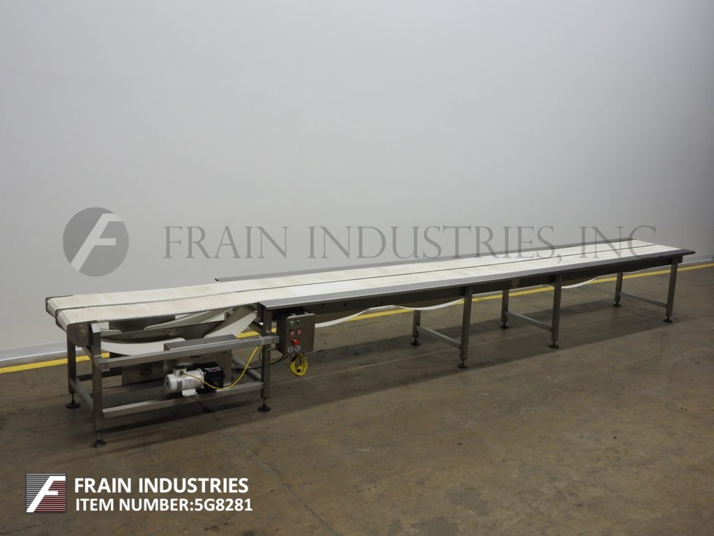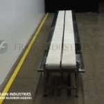 Back to All EquipmentDual 12" wide x 272" long stainless steel conveyor. (2) independently driven 12" wide and 272" long Intralox style belts have an infeed / discharge range of 33" – 38". Equipped with (2) ½ Hp drives, 6" wide x 220" long shelves on both sides and mounted on (10) legs with leveling pads. Includes independent push button start / stop controls and variable speed dials with a universal E-stop.