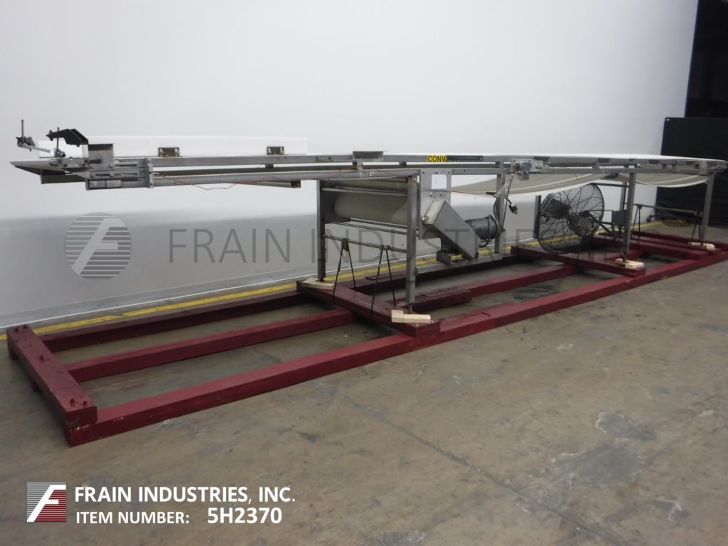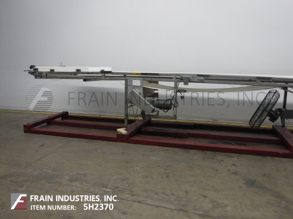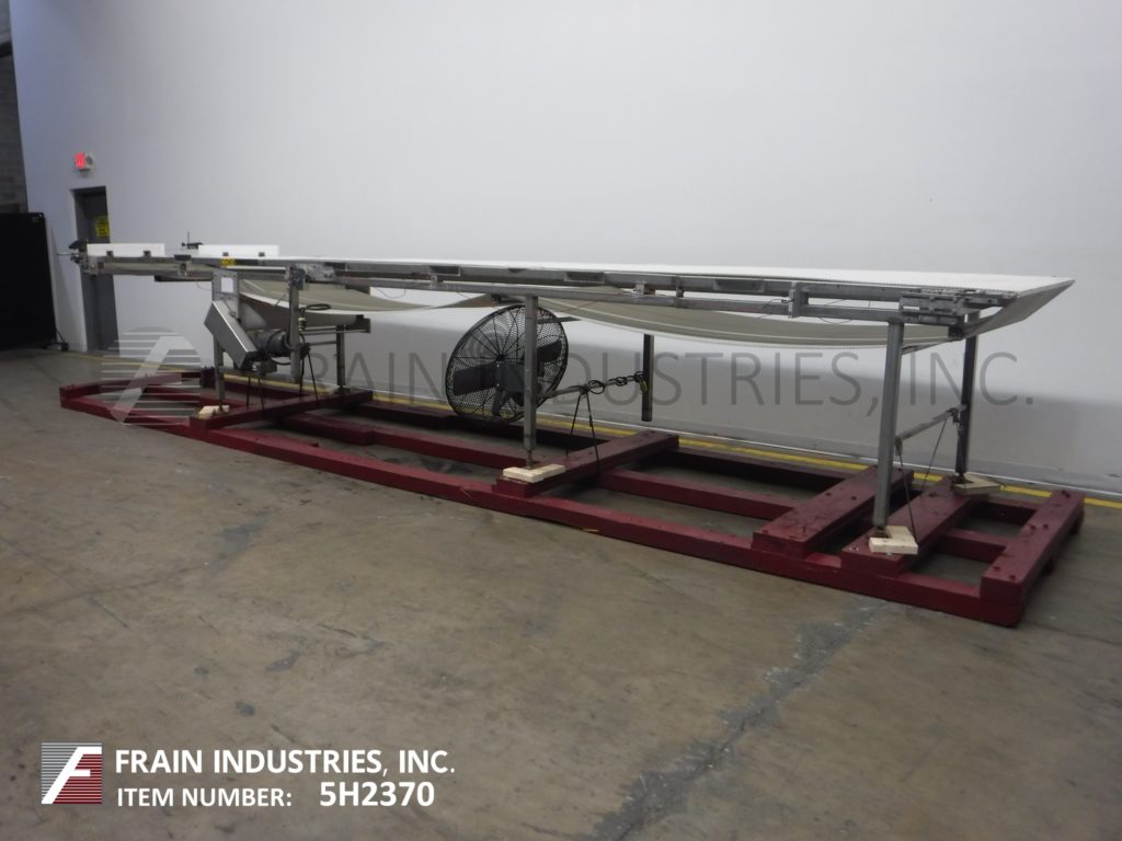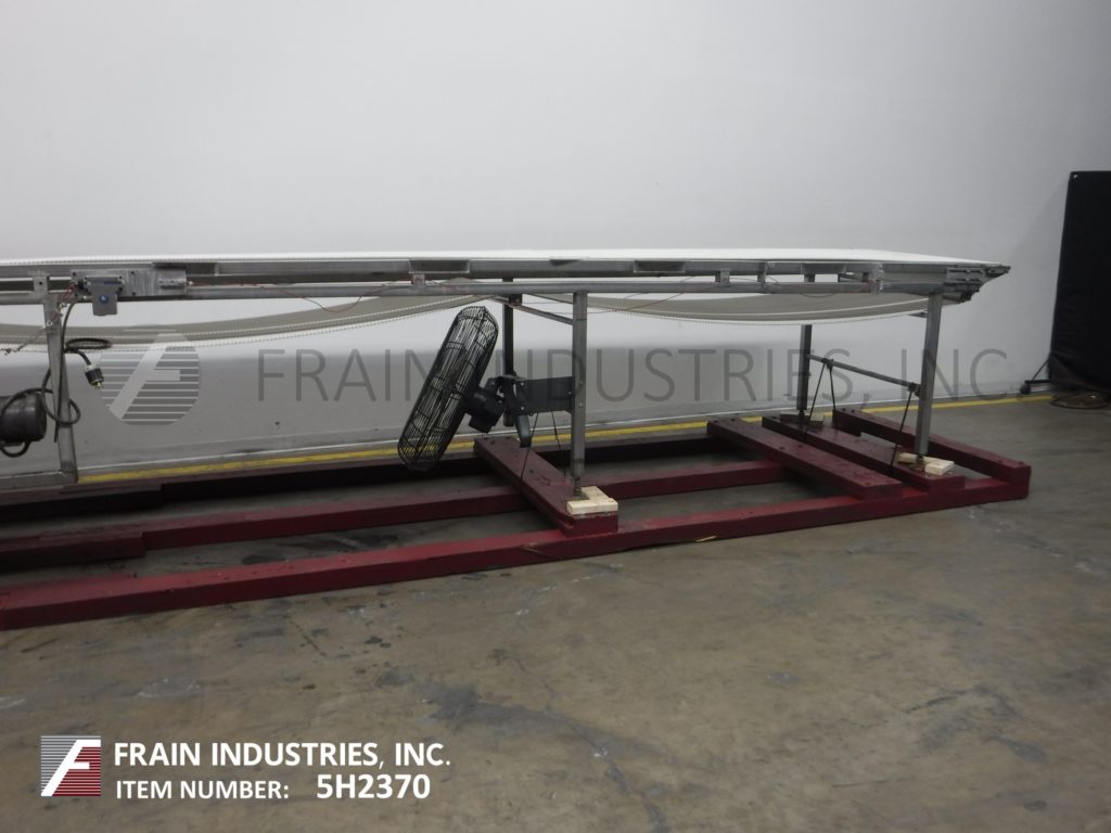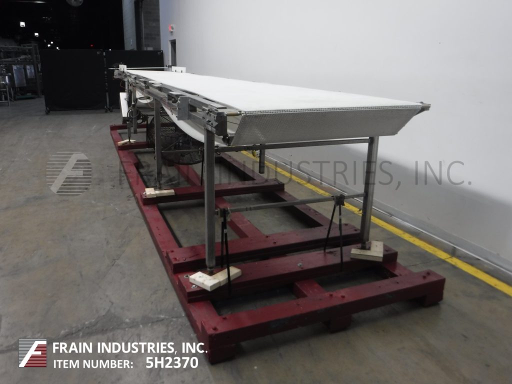 Back to All Equipment42" wide x 306" long stainless steel table top conveyor. 42" wide and 306" long Intralox style belt has an infeed / discharge range of 43" to 48" with a center drive and mounted on (6) legs with leveling pads.