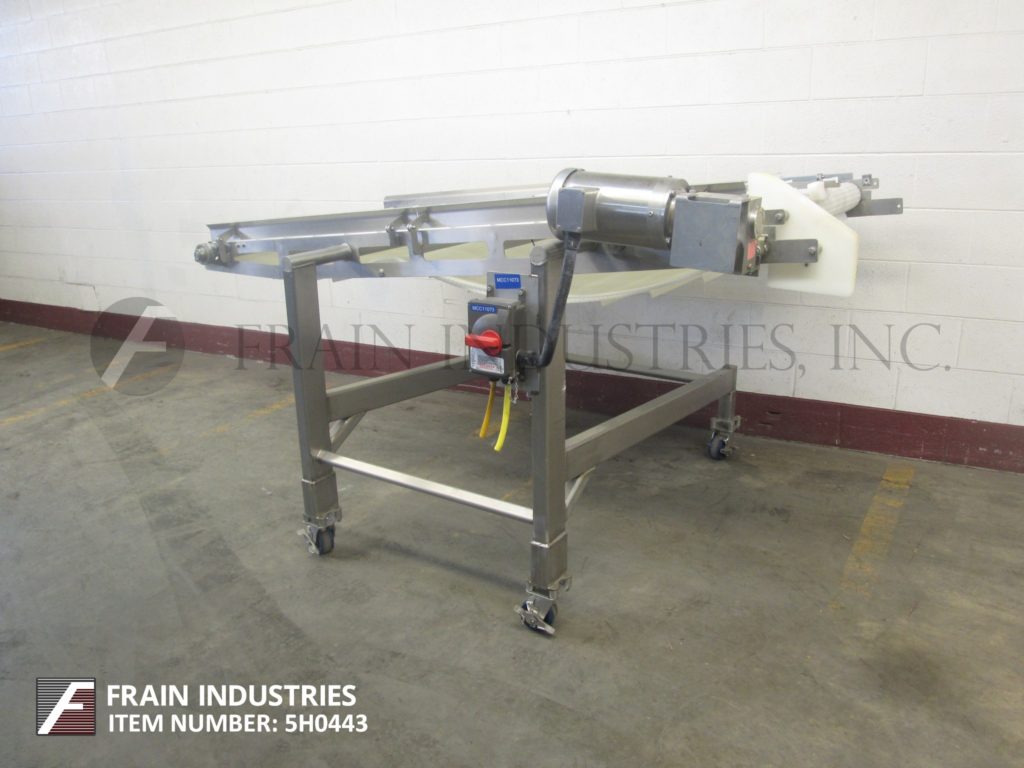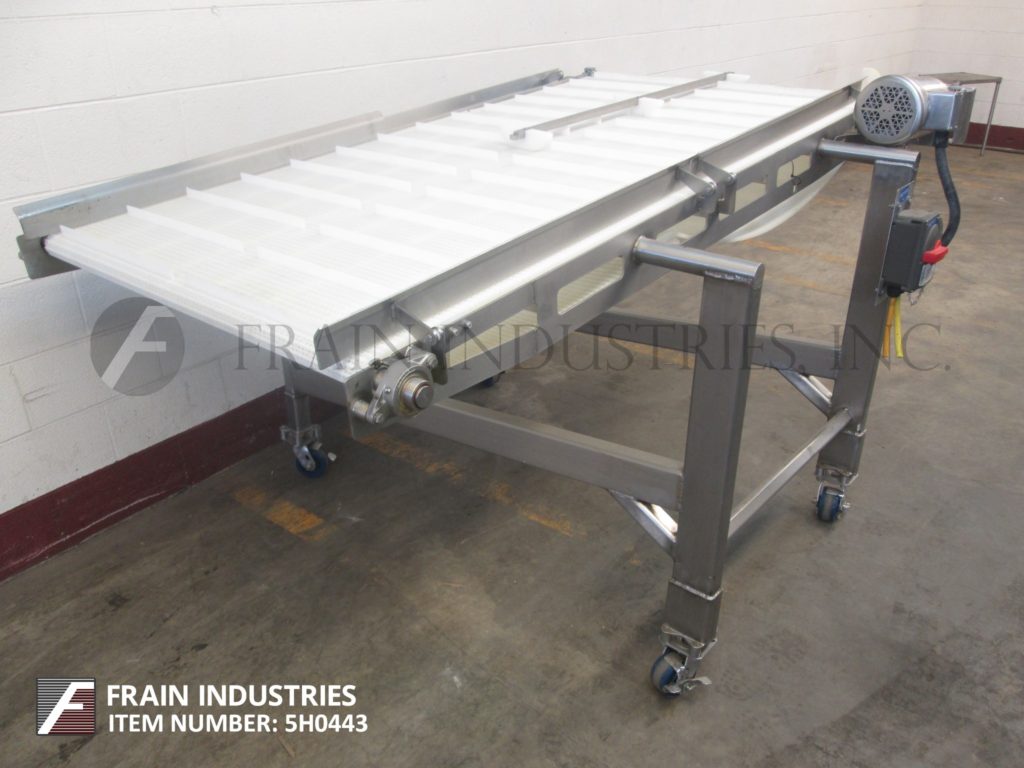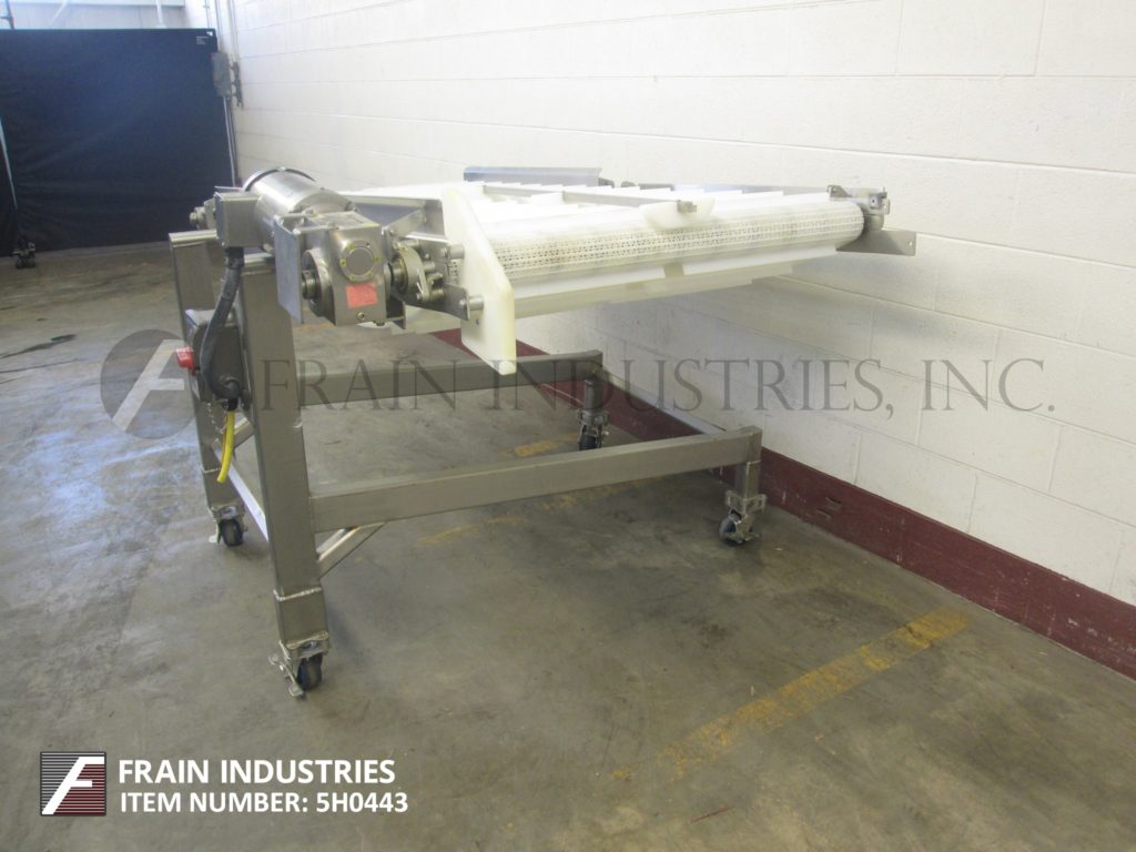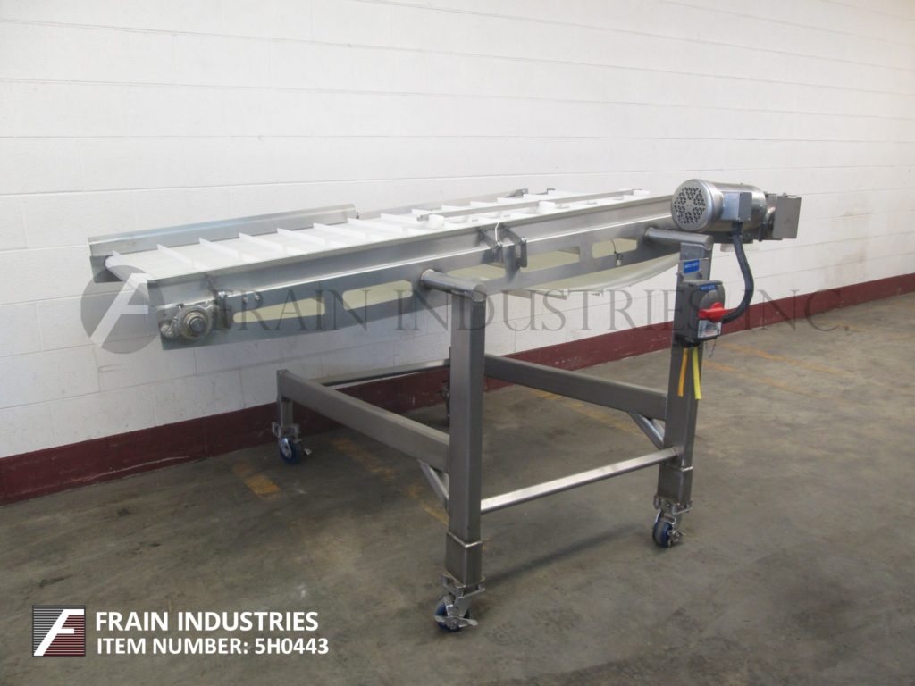 Back to All EquipmentStainless steel, 42" wide x 82" long belt conveyor. 42" wide and 82" long cleated Intralox belt has an infeed of 40" and a discharge of 46". Equipped with 1" high cleats set on 6" centers and powered by a 1 Hp drive. Mounted on a (4) leg frame with casters.