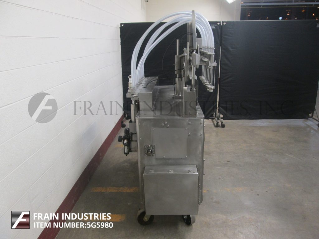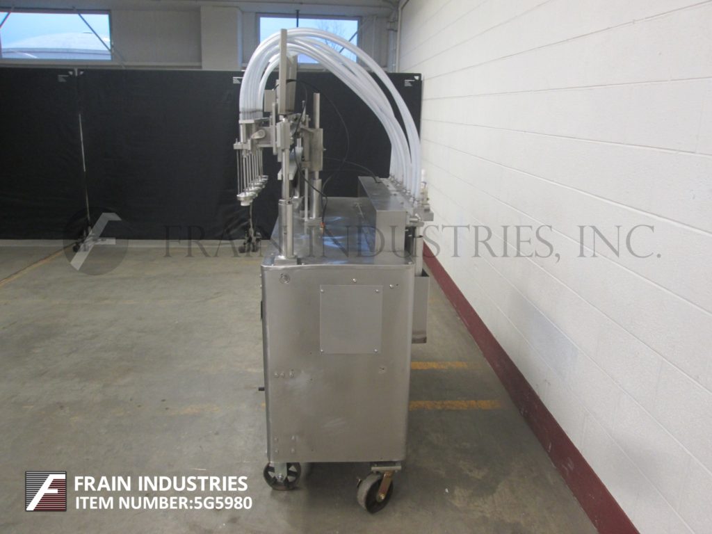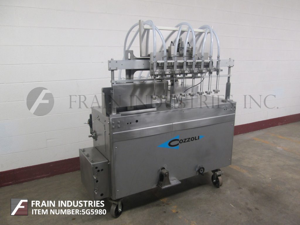 Back to All EquipmentCozzoli, intermittent motion, (8) head in-line piston filler, rated from 24 to 120 containers per minute – depending on materials, application, and machine configuration. Fill range: up to 600cc with proper change parts. Equipped currently with (8) 2" ID x 8-1/2" Long (240cc) pistons, 30" long nozzle slide bar with 1/4" OD diving nozzles, currently set on 4" centers, no container / no fill. Mounted on base frame with casters.