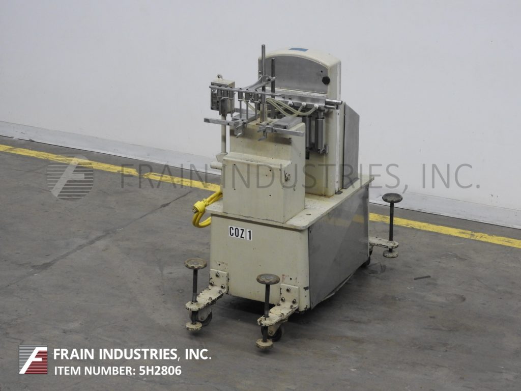 Back to All EquipmentCozzoli, Model VR526, Inline, intermmitent motion, (6) head piston filler. Rated from 6 to 30 cycles per minute with number of containers – depending on materials, application and machine configuration. Maximum fill: 120cc with proper change parts. Equipped 12" long slide bar with (5/16)" OD diving nozzles and mechanical container indexing. Control panel has push button start / stop controls. Mounted on mild steel base frame with casters and leveling legs.