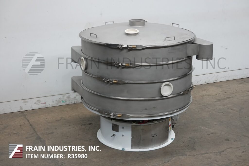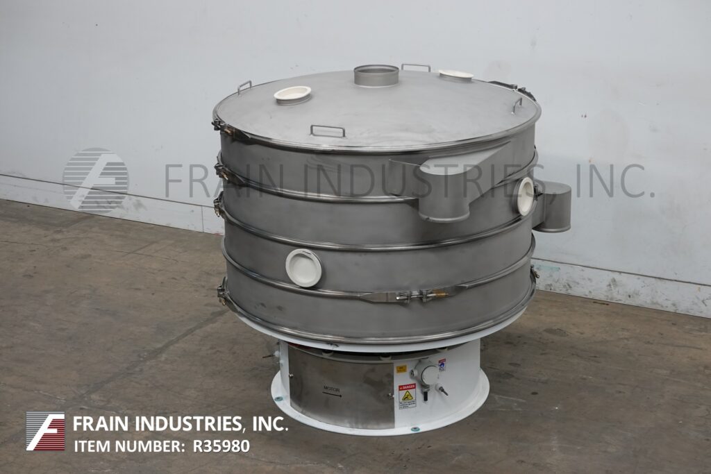 Back to All EquipmentCustom Advance, 60" diameter, separation vibratory sifter. Volumes per hour – depending on materials, application and machine configuration. Equipped with (4) 60" OD x 8" High stainless steel seperation sections and (3) screens (change part per application). Each deck has 12" long discharge spout with 8" OD discharge port and (2) 6" OD ports with plugs. Discharge ground clearances; 46" / 38" / 29" / 22". Top cover has 8" OD center product port and (2) 6" OD inspection ports with plugs. Mounted on vibratory pedestal style base.
