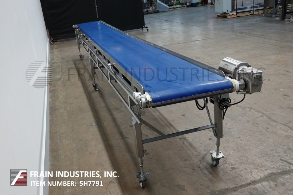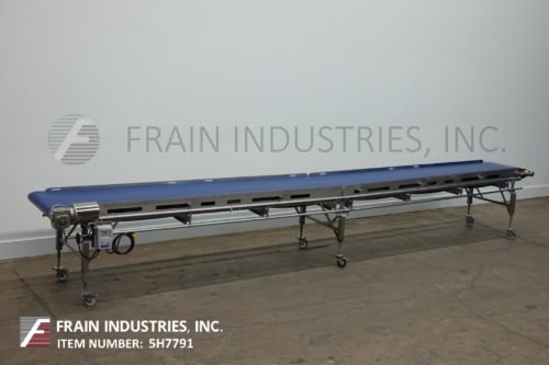 Back to All EquipmentDorner, 23" wide x 246" long stainless steel belt conveyor. 23" wide and 246" long food grade belt has an infeed and discharge height of 35". Equipped with a ½ HP drive, variable speed control and mounted on locking casters