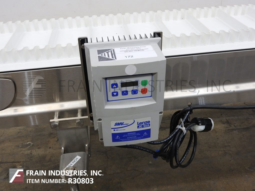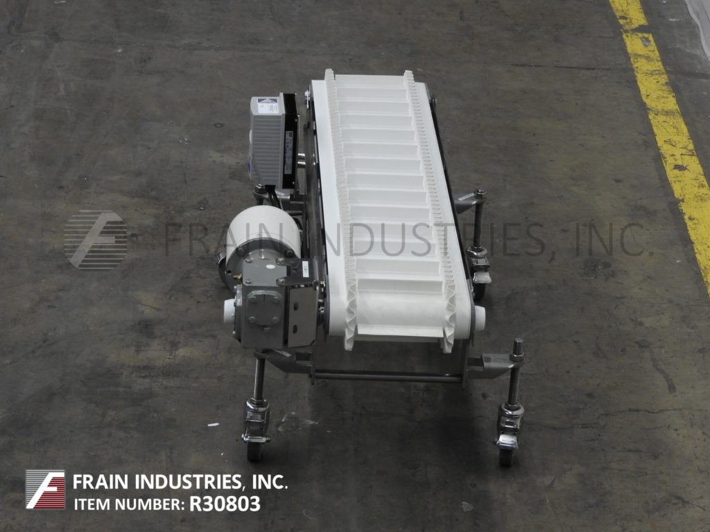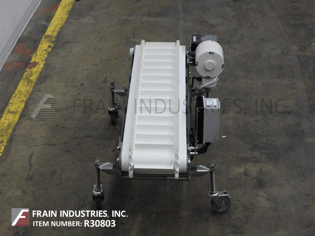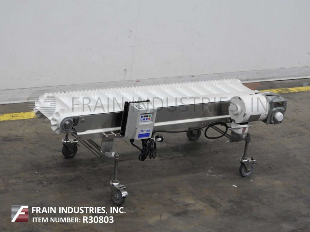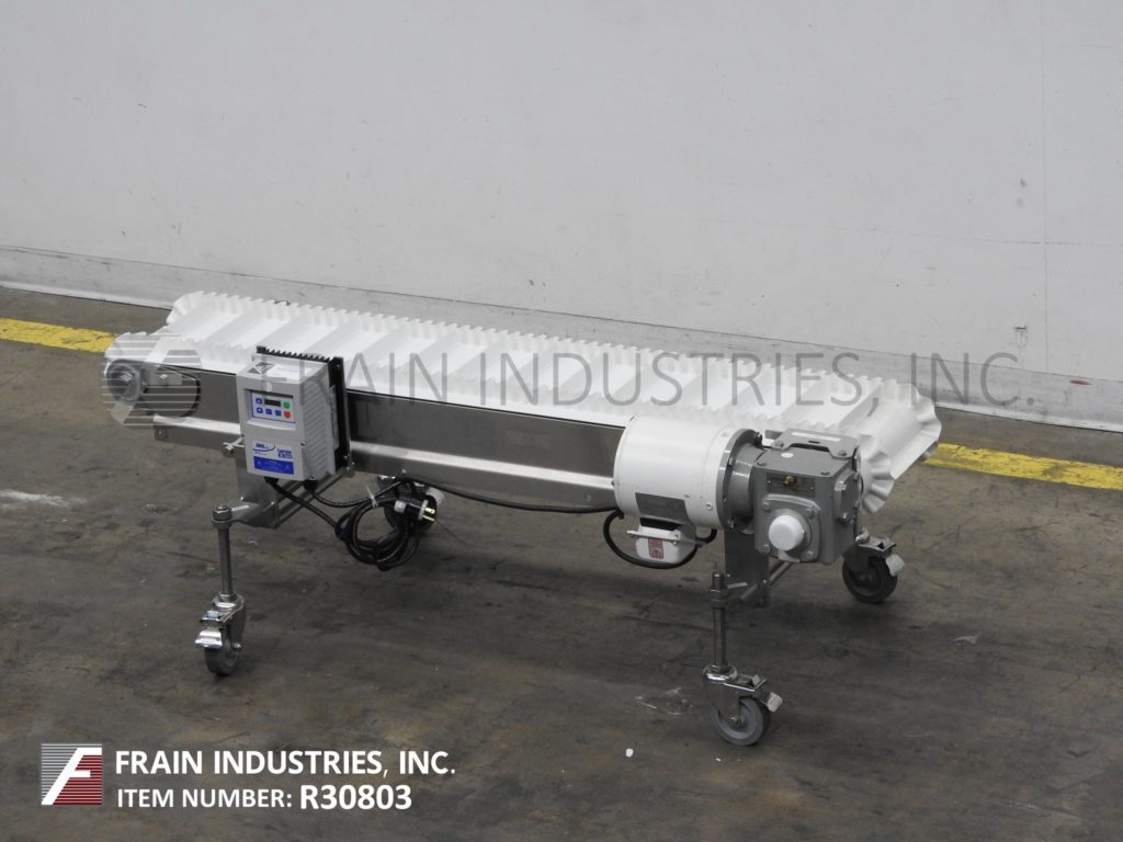 Back to All EquipmentDorner, stainless steel cleated feed conveyor. Equipped with a 7½" wide x 55" long Neoprene belt with 1¼" high cleats set on 4" centers, 14" to 20" infeed / discharge height. Powered by a ½ hp drive with a variable speed controller.
