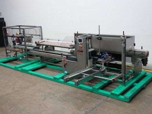 Back to All EquipmentFully automatic case erector / packer / glue sealer capable of 5 to 25 cases per minute The product accumulator runs parallel to the case erector with a right angle air cylinder transfer for a single layer of product and features a 148"L infeed conveyor, and a 13"L by 19"W product transfer station. The wrap around case erector 80"L magazine with hand crank adjustments,Nordson hot melt, glue controllers, amber strobe light for non-shutdown conditions, red strobe light for shutdown conditions, blue strobe light for low materials, 21" centers, hand cranks and indicator scales for carton size adjustments, Machine equipped with an Allen Bradley PLC programmable, and 5/8" thick clear lexan guarding with electrical interlocks.