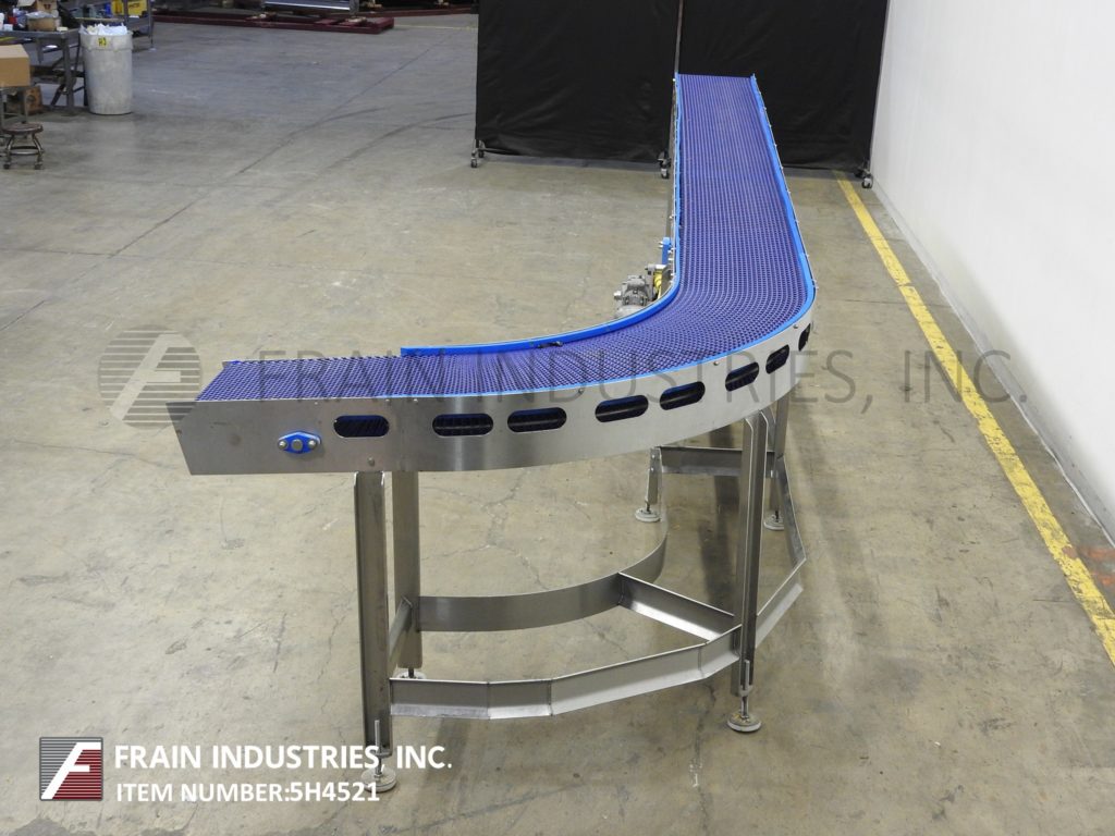 Back to All EquipmentE-Quip, 17½" wide x 245" long, 90° curved stainless steel conveyor. Equipped with 165" long straight section into 90° curve, to 24" long straight section. Powered by a 1 Hp drive and mounted on leveling legs.