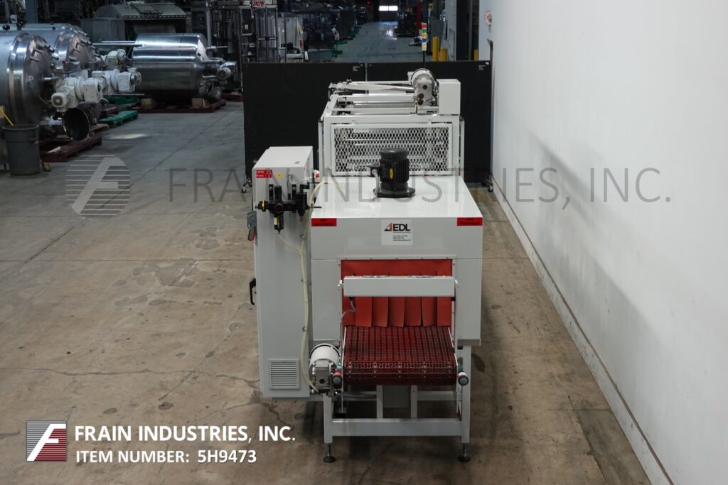 Back to All EquipmentEDL, inline, continuous motion, bundler and integrated shrink tunnel. Rated up to 55 bundles per minute – depending on materials and application. Product size range: 7" to 28" in Length x 6" to 22" in width x 4" to 9" in Height. Equipped with 40" long x 14" wide in feed conveyor, 45" long x 14" wide metering conveyor with pneumatic gate indexing, 23½" wide hot impulse seal jaws set on 30" centers stream flight bar, side mounted film racks, with film rolls up to 22" in width; and 14" OD. Single zone shrink tunnel with 24" wide flex link conveyor and 24” in width x 16" in height aperture and 60" long chamber and top mounted blower motor. Control panel has Allen-Bradley controller with touch screen HMI. Mounted on heavy duty frame with status light bar and interlocked safety guarding.