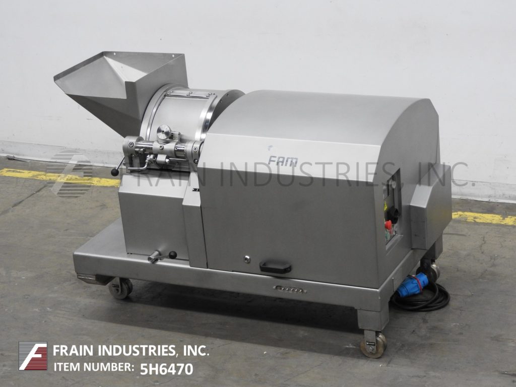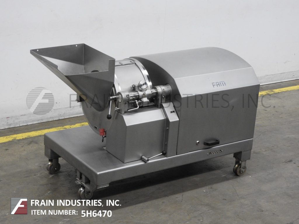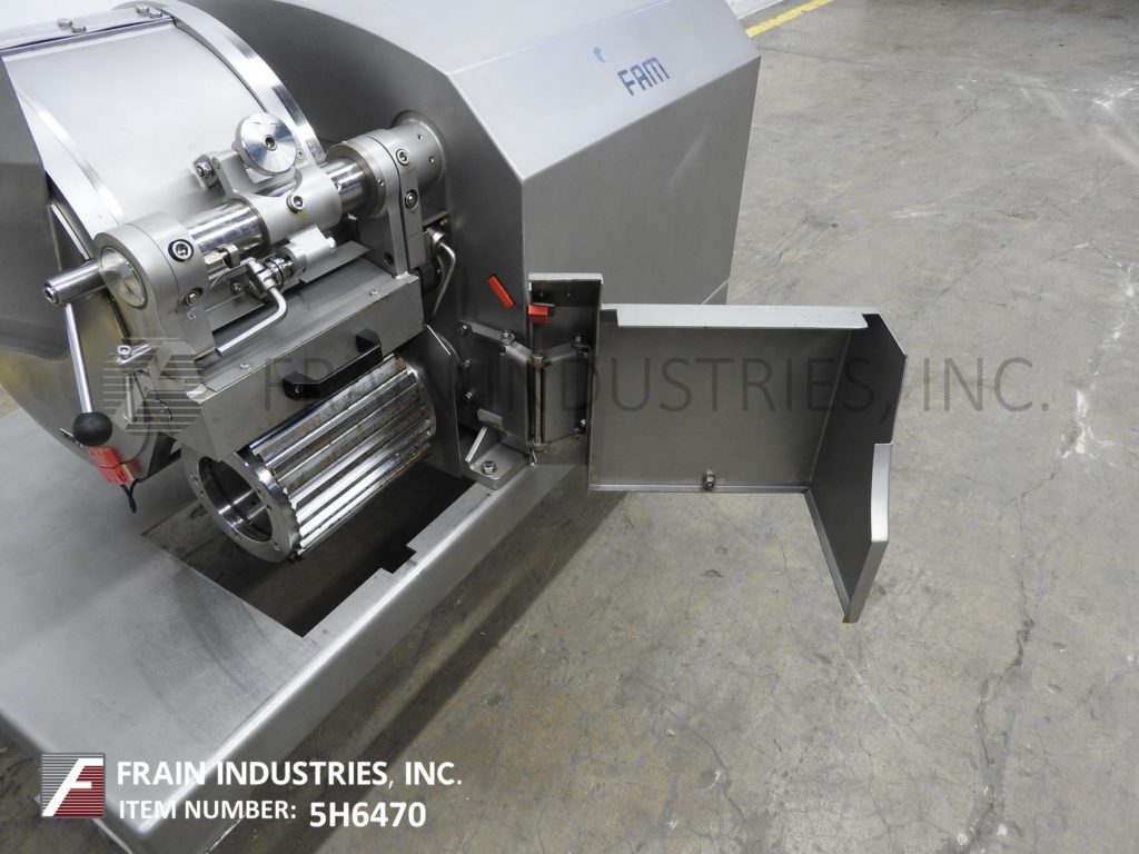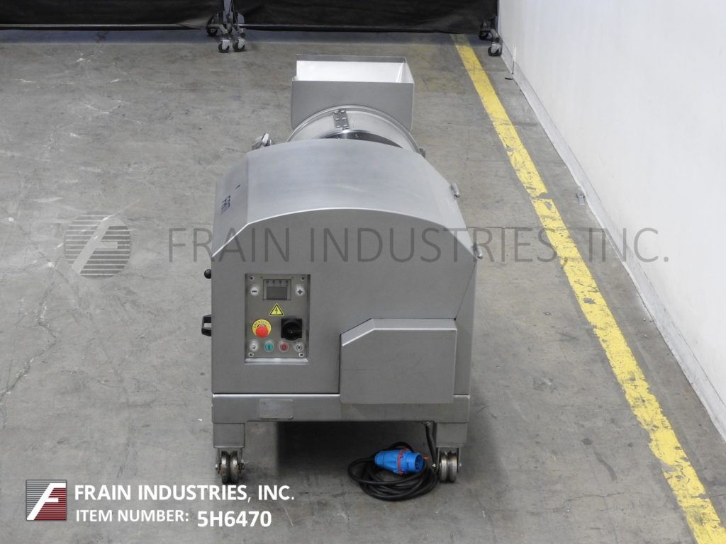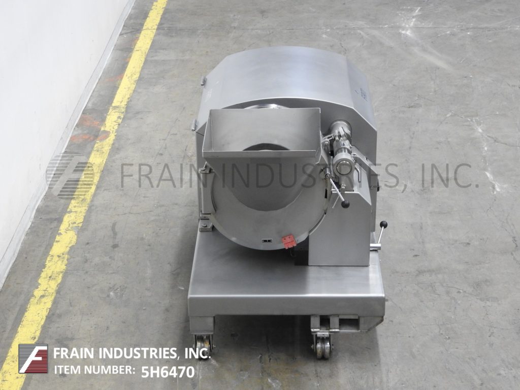 Back to All EquipmentFAM Model ILC, all stainless steel construction, slices, strip cuts and dices up to 2,205 pounds of product per hour – depending on materials and application. Equipped with 18" x 17" stainless steel product feed hopper, 11" OD product port to processing chamber, and has combination of 3 cutting tools for flexibility in choice of cut-sizes and shapes with little juice loss, no cellular damage for smooth cut surfaces, all contributing to extended shelf-life. Cut sizes, Flat slices: 1,60 mm to 28 mm. crinkle slices 3,20 mm to 25 mm. Strip cuttting: circular knife cuts: 2,50 mm to 76 mm, crosscut knife cuts: 4 mm to 64 mm. Dices: flat cut: 3 mm to 64 mm, crinkle cut: 7,10 mm to 16 mm and all knives are changeable for high-capacity production of various applications such as vegetables, fruits and potato processing with proper change parts. Control panel has start, stop and e-stop controls with readout. Mounted on stainless steel frame with interlock safety switch and casters.