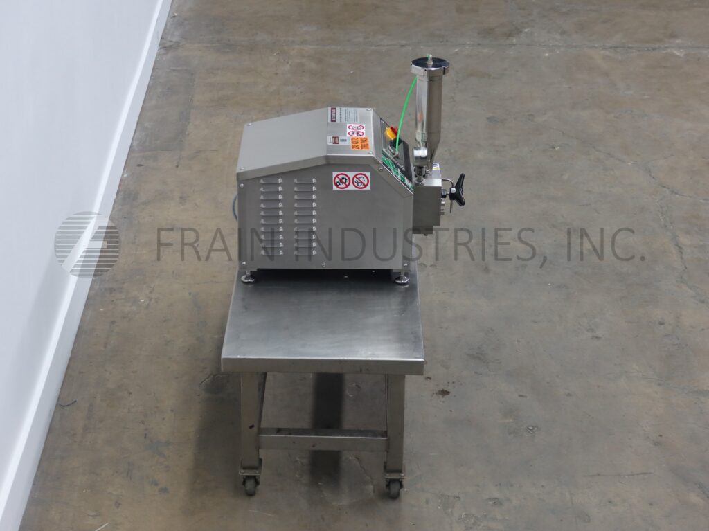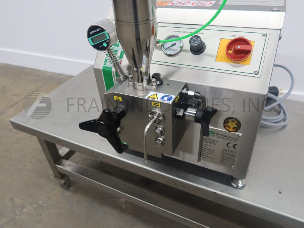FBF Italia, Model 2.50 Lab, two stage, homogenizer. Rated output capacity of 50 liters per hour – depending on materials, application and machine configuration. Maximum operating pressure up to 8700 psi. Equipped with manual homogenizing valve actuator assembly with 3¼" diameter x 12" deep pressurized hopper, ¼" OD discharge port and digital pressure gage.