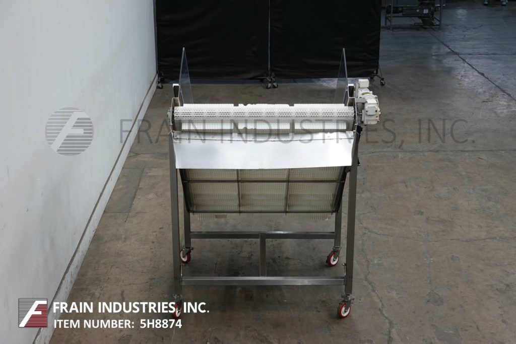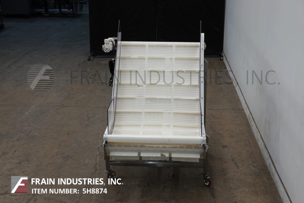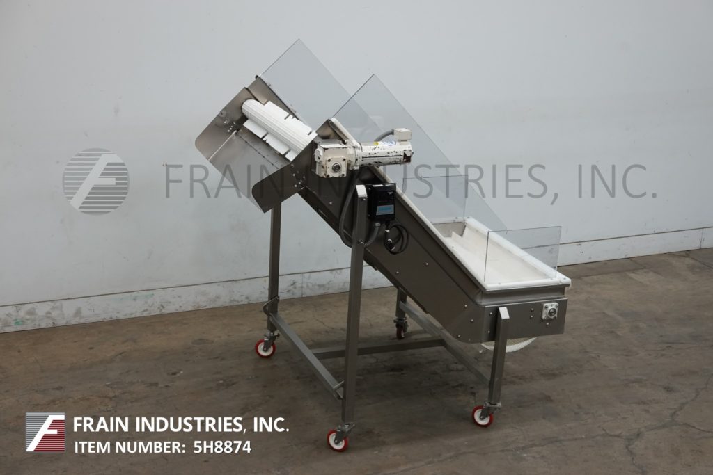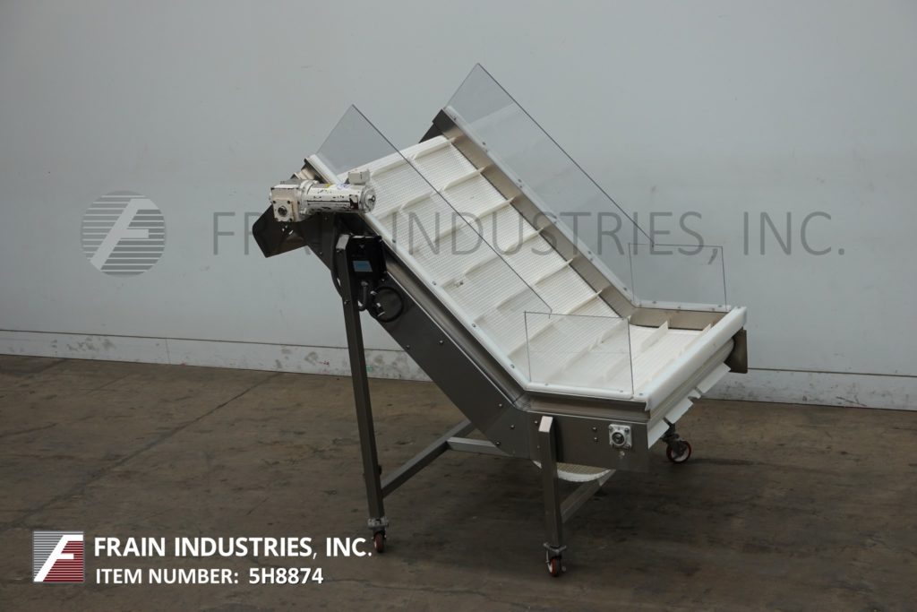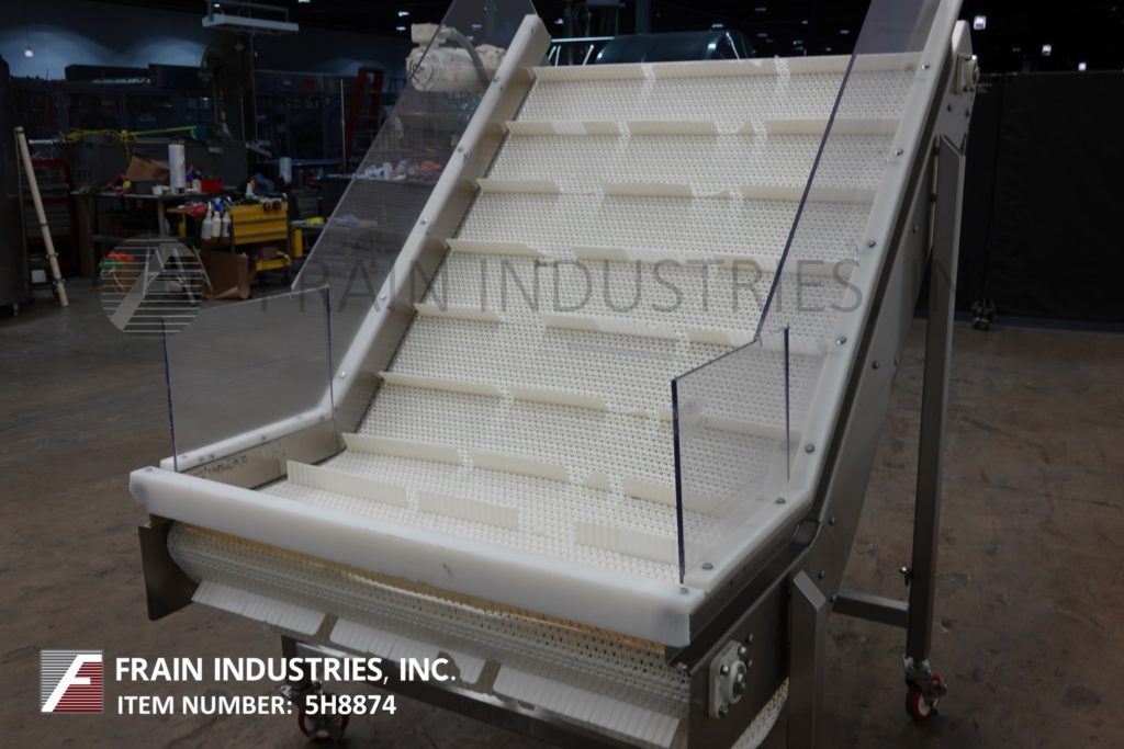 Back to All EquipmentStainless steel inclined cleated conveyor with amount of product per hour – depending on materials and application. Equipped with 45" wide x 70" long white neopherem belt with 2" high cleats set on 8¼" centers. 29" in feed height and 67" discharge height with discharge chute with 53" ground clearance. Top mounted ½ Hp motor drive with variable speed controller. Mounted on stainless steel frame with casters.
