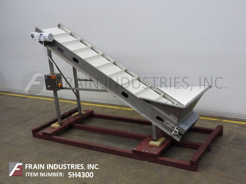 Back to All EquipmentHexcore stainless steel, inclined cleated feed conveyor with pounds of product per hour – depending on materials and application. Equipped with 34" long x 41" wide x 18" deep stainless steel product hopper with 24" Wide x 130" Long, neoprene belt, incline cleated belt conveyor has 32" high infeed with 2" high cleats set on 12½" centers and 77" discharge height with top mounted ½ Hp motor drive. Mounted on a (4) leg stainless steel frame