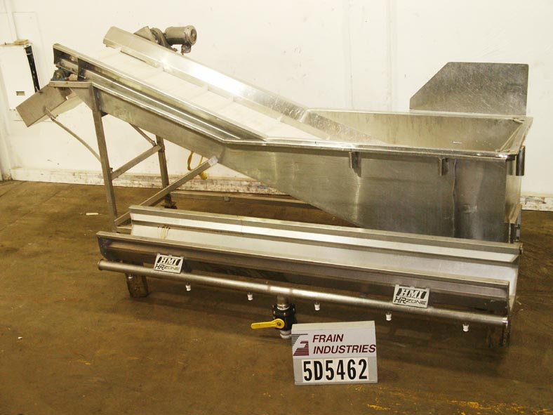 Back to All EquipmentIncline conveyor with 40" discharge height and 23" wide x 146" long cleated belts featruring 3" high cleats and 1 hp drive motor. features a stainless steel product hopper with dimensions of 70" in Length x 30" in Width x 28" in Depth (at deepest point) approx 15 cu ft. Equipped with water bath infeed measuring 120" in Length x 20" in Width x 12" in Depth.
