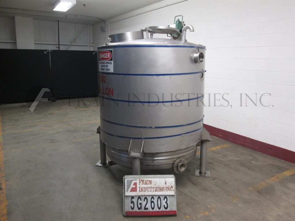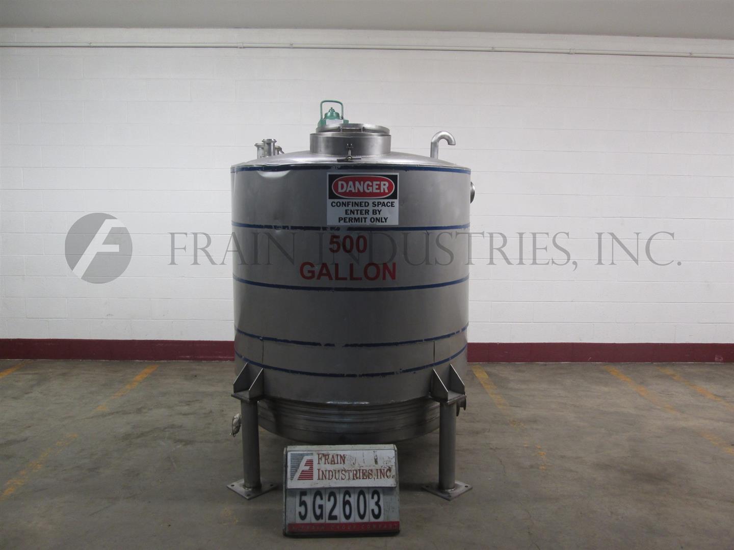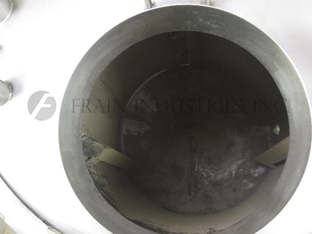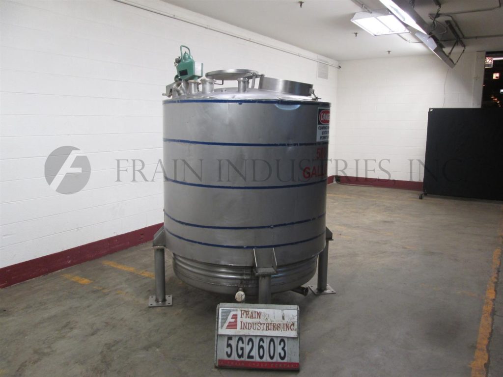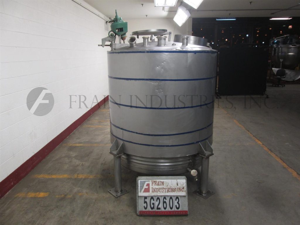 Back to All EquipmentFeldmeier, 500 gallon, 316 stainless steel, low pressure jacketed tank. 51" diameter x 60" straight wall. Side mounted prop style agitator is pneumatically powered. Low pressure jacket has (2) 1.5" ID inlet/outlet connections. Vessel has a dome top with (1) 17" manway, (1) 3.5"ID, (1) 3" ID, (2) 2.5" ID, (1) 1.75" ID and (1) CIP spray nozzle. The sidewall has (1) 4.5" ID and (1) 7.5" diameter four-bolt pattern flange fittings with 3.25" ID. Dish bottom has (1) 2.5" ID side discharge with 18" ground clerance. Mounted on (4) stainless steel legs.