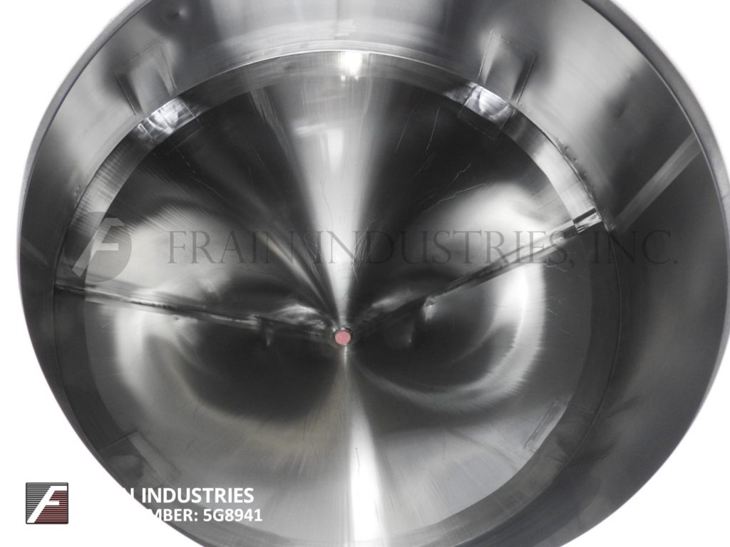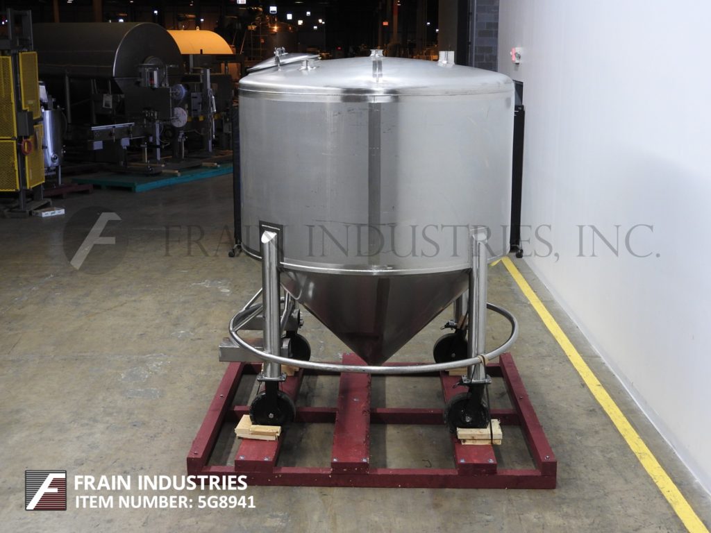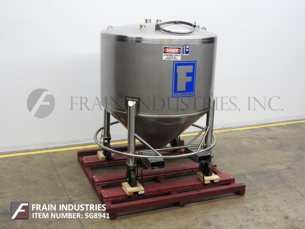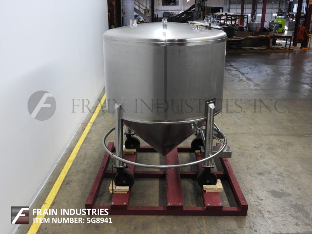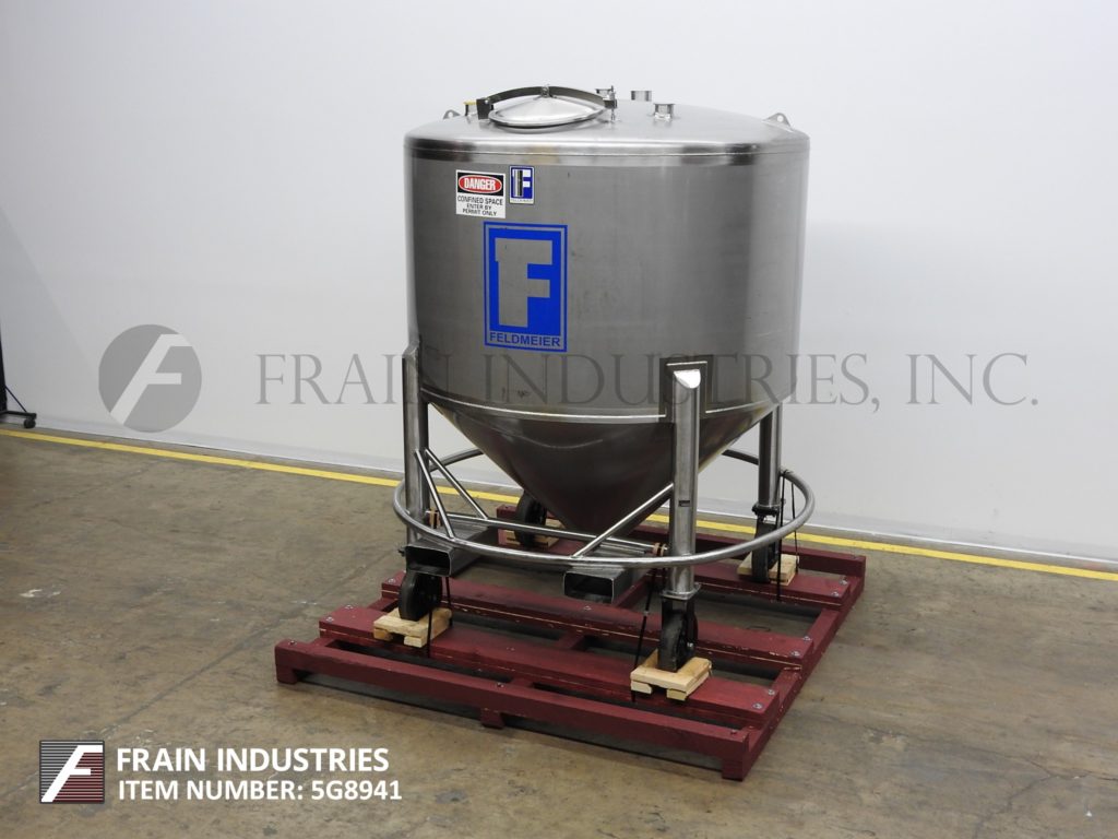 Back to All EquipmentFeldmeier, 1000 gallon capacity, 316 stainless steel single wall tank. Vessel dimensions: 72" diameter x 80" deep with a 44" straight wall. Equipped with dome top and 18" man way with flip up, bolt down cover. Cone bottom has a 3½" OD / 3" ID Tri-Clamp style center bottom discharge with 9" ground clearance. Mounted on stainless steel (4) leg forkable base with casters.