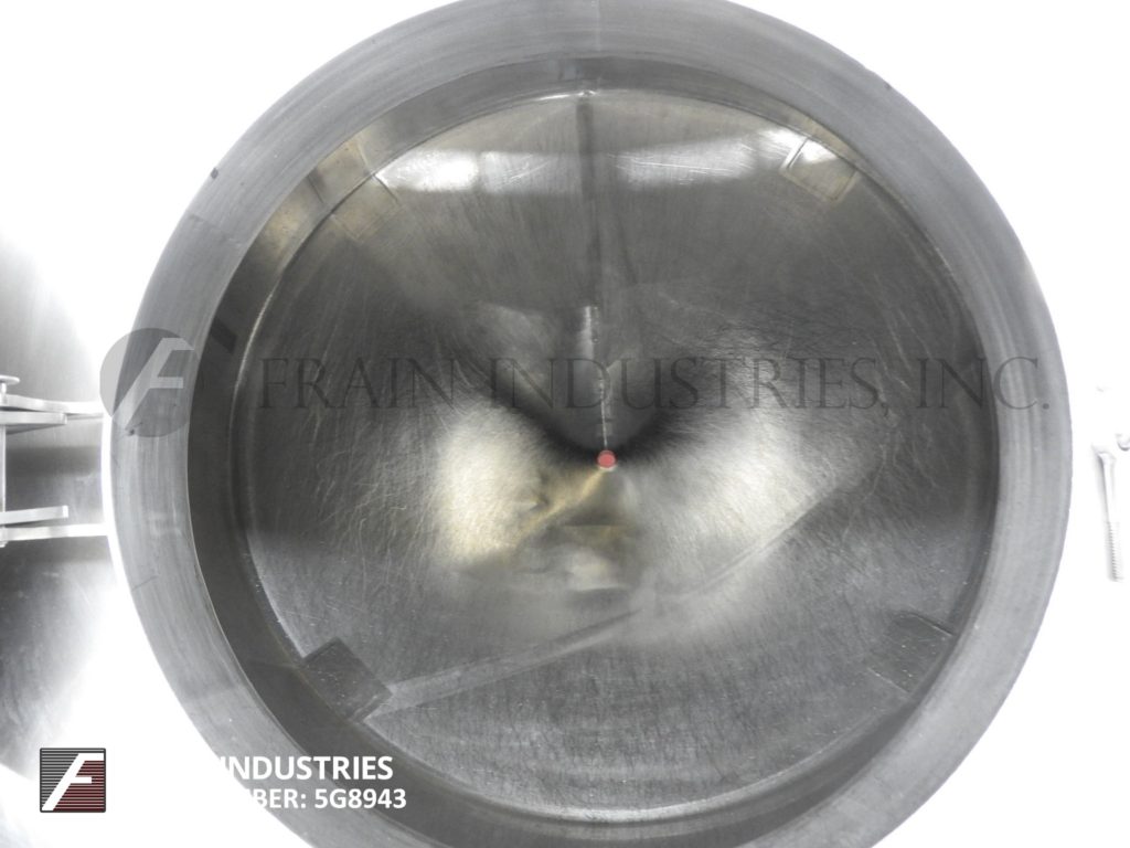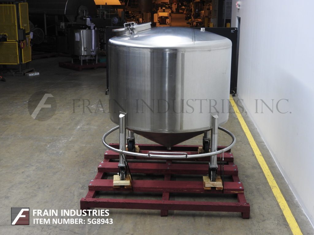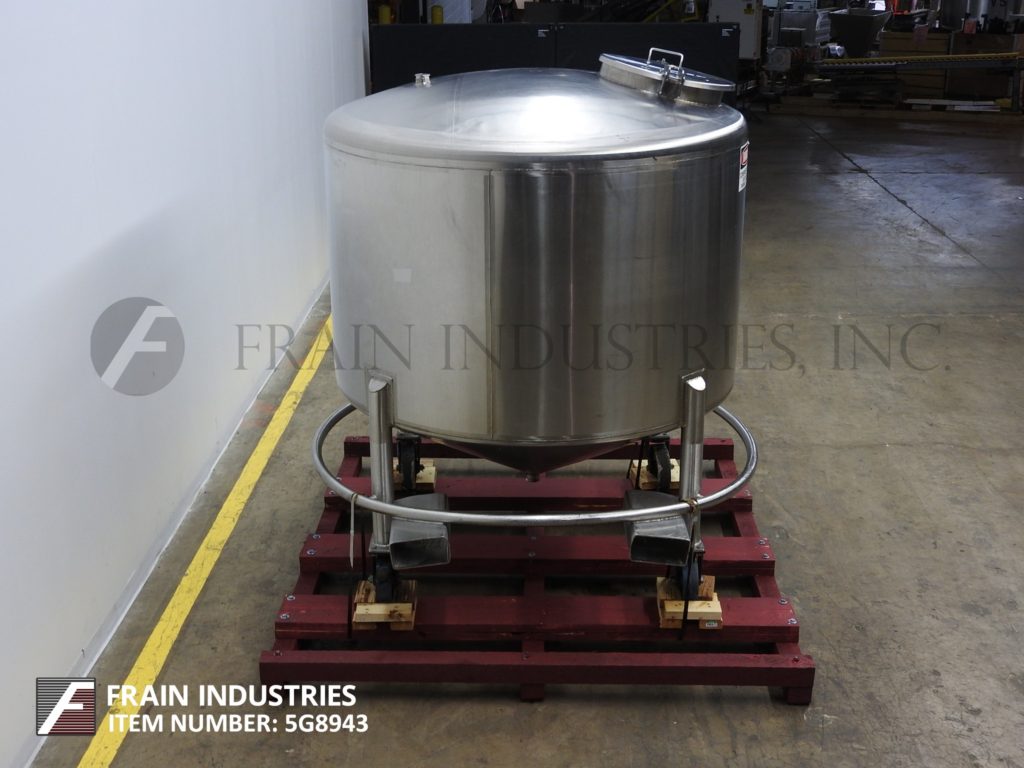 Back to All EquipmentFeldmeier, 750 gallon capacity, 304 stainless steel single wall tank. Vessel dimensions: 65" diameter x 63" deep with a 44" straight wall. Equipped with dome top and 20" man way with flip up, bolt down cover. Cone bottom has a 2½" OD / 2" ID Tri-Clamp style center bottom discharge with 12" ground clearance. Mounted on stainless steel (4) leg forkable base with casters.