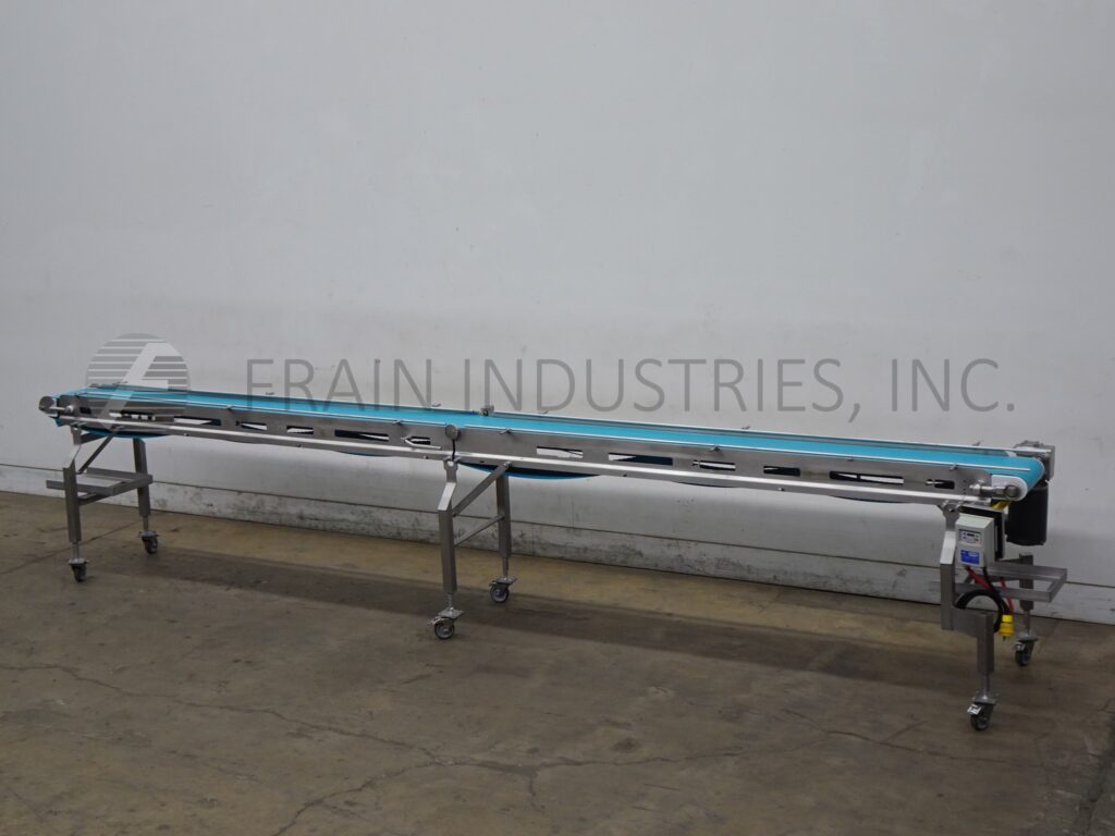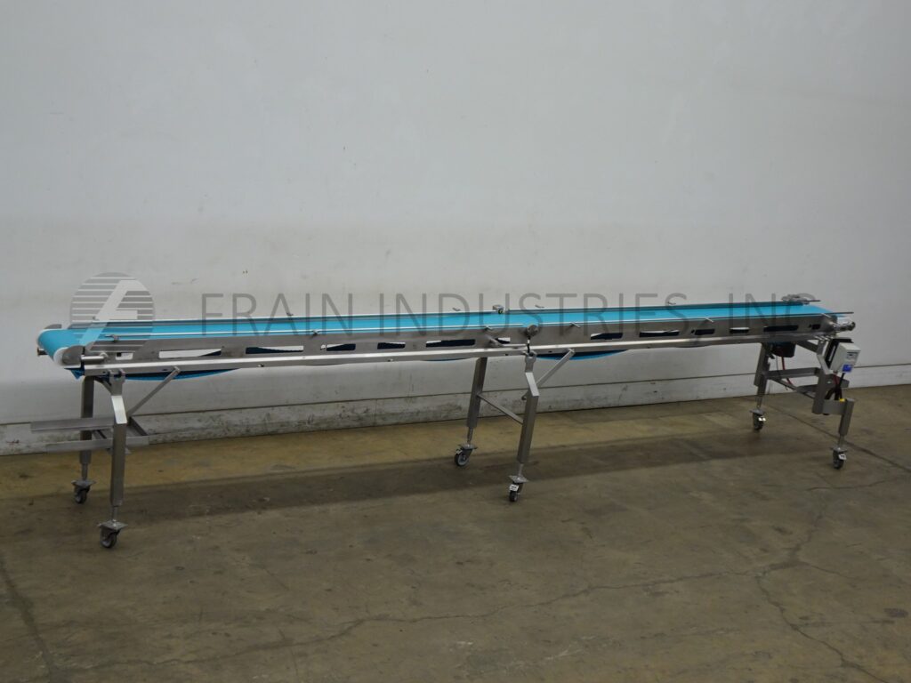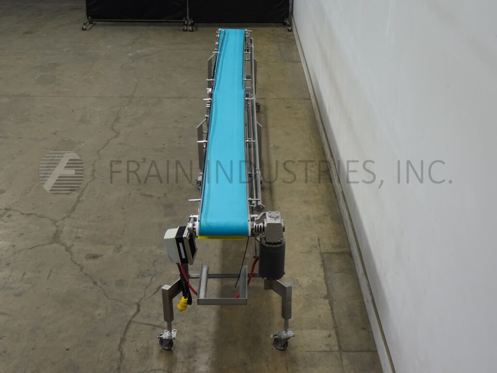 Back to All EquipmentFEMC, stainless steel conveyor. Equipped with 12" wide and 210" long, belt conveyor has 40" infeed / discharge height and 1 Hp drive with variable speed controller. Mounted on (6) legs.
