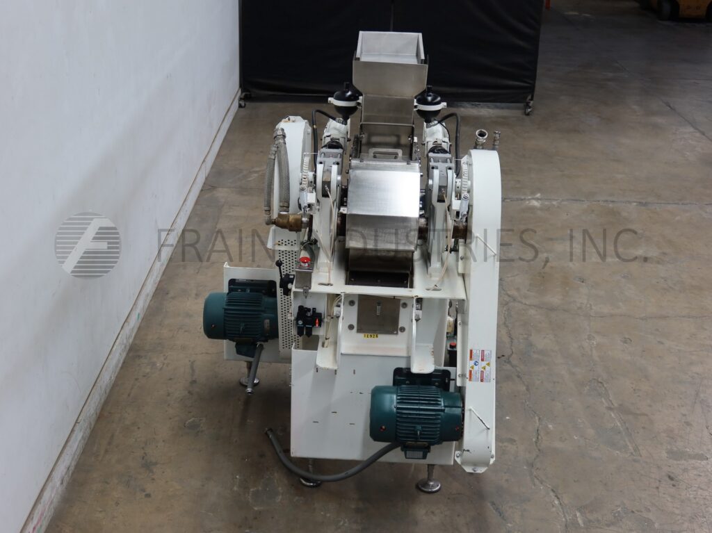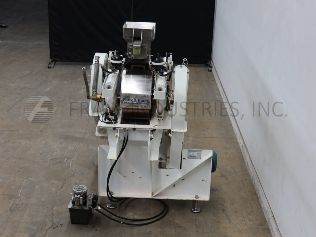 Back to All EquipmentFerrell Ross, Model 18 x 12 Flakemaster, flaking mill. Rated up to 150 lbs per hour – depending on materials, application and machine configuration. Equipped with an 11½" wide x 16" long vibratory feed pan, (2) 12" wide x 18" diameter jacketed compression rollers each powered by a 7½ drive, air over hydraulic pump, pneumatic scrapers and 30" ground clearance from the frame.
