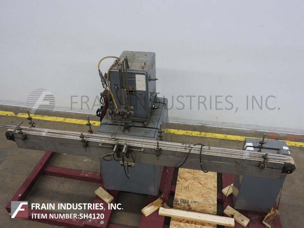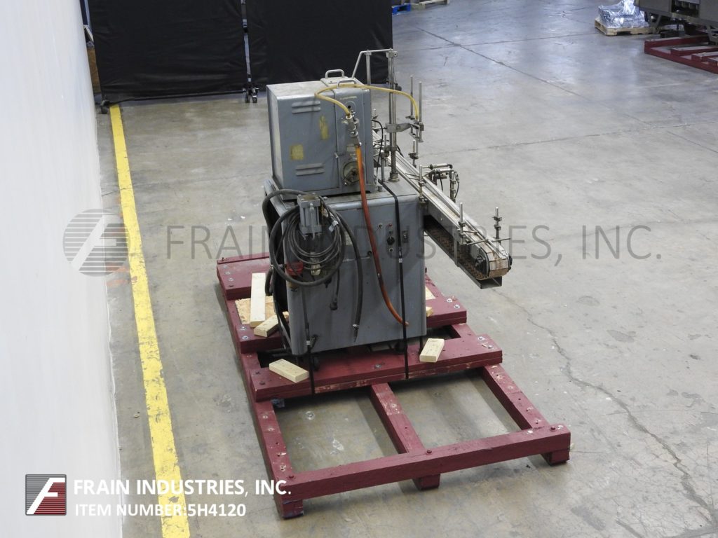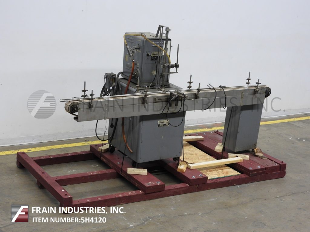 Back to All EquipmentFilamatic, Model DAB-16, automatic 2 piston filler. Rated from 3 to18 cycles per minute with number of container – depending on materials, application and machine configuration. Fill range of: 60cc to 520cc with proper change parts and is equipped with (2) FKS 130cc pistons with fill accuracies of ± 0.5%, pneumatic gate indexing, 7/16" OD diving nozzles and a 3¼" wide x 102" long delrin conveyor. Control panel with on / off switch and variable speed dial.