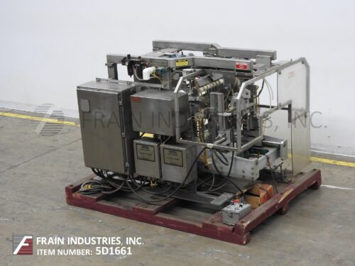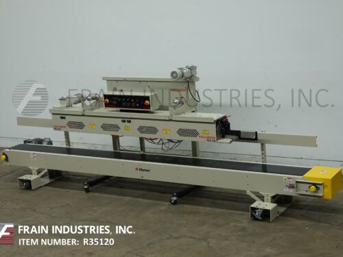 Back to All EquipmentFischbein, Model PBC 6000, right to left, pre-applied glue, bag heat sealer. Rated from 0 to 85 linear feet per minute with number of bags – depending on materials, application and operator dexterity. Bag size range: 4" to 26" in Width up to 56" Length. Filled bag weight from 1 lbs to 110 lbs, will run most gusseted and flat bags. Equipped with front break away channel, bag guide with folding plow for single fold, electric heater to heat up and activate pre-applied glue, adjustable pressure 12" long dual compression belt section. Control panel has touch pad with heater on / off and motor run, auto, stop switches, bag jam detection, over temperature sensor shut down, with start, stop, e-stop push button controls. Mounted on hand crank height adjustable base frame with casters and 10′ long x 12" wide black PVC product belt conveyor.