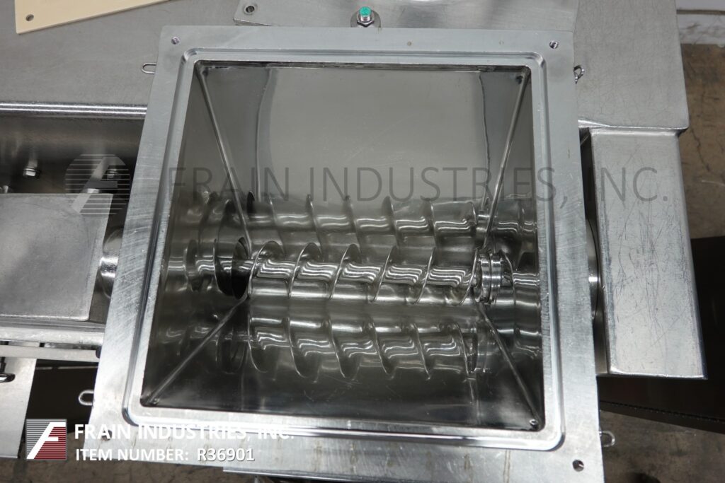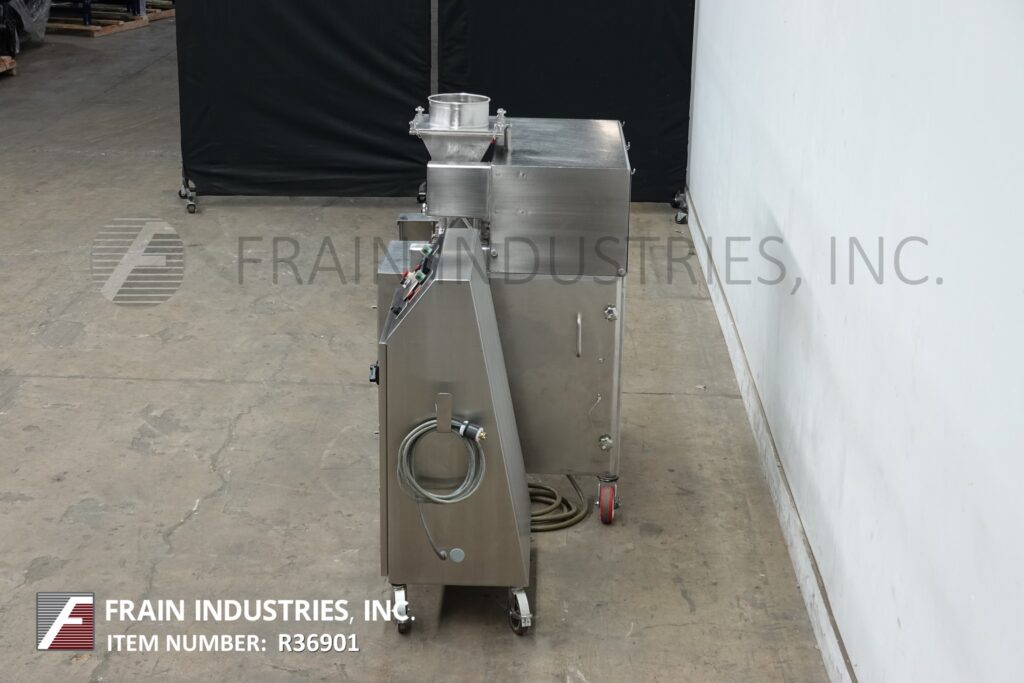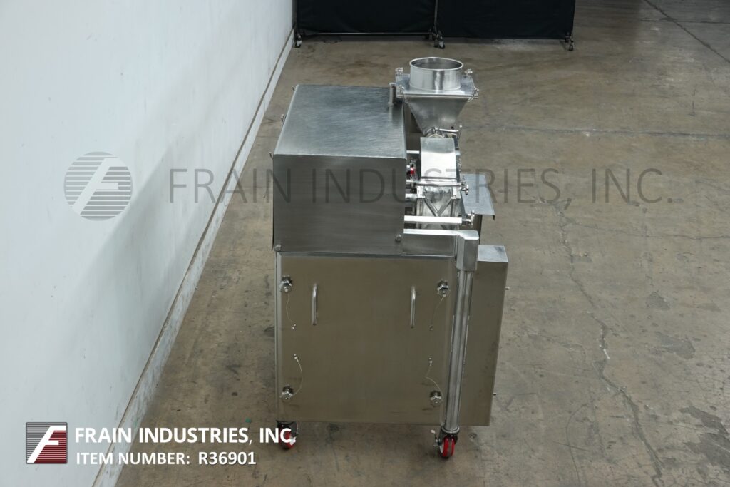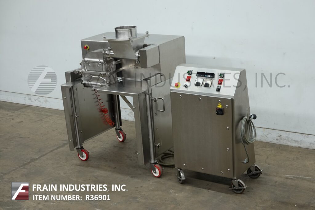 Back to All EquipmentFitzmill, Model D6A, compact, on-wall design, 316 SS construction, hammer mill with production rates per hour – depending on materials and application. Equipped with 12" long x 12" wide x 16" deep stainless steel product feed hopper 3" OD stainless steel vari speed metering feed screw to enclosed process chamber with (16) fixed stainless steel knife / impact blades and 5½" long x 13" wide product discharge port with 31" ground clearance. The in-wall and on-wall configurations of the VFS-D6A are designed to contain the drive motors in a separate room or technical area. Control panel has Mill and VFS start/stop push button controls.Used for precision grinding and controlled particle size reduction in pharmaceutical processing and other sanitary industries.