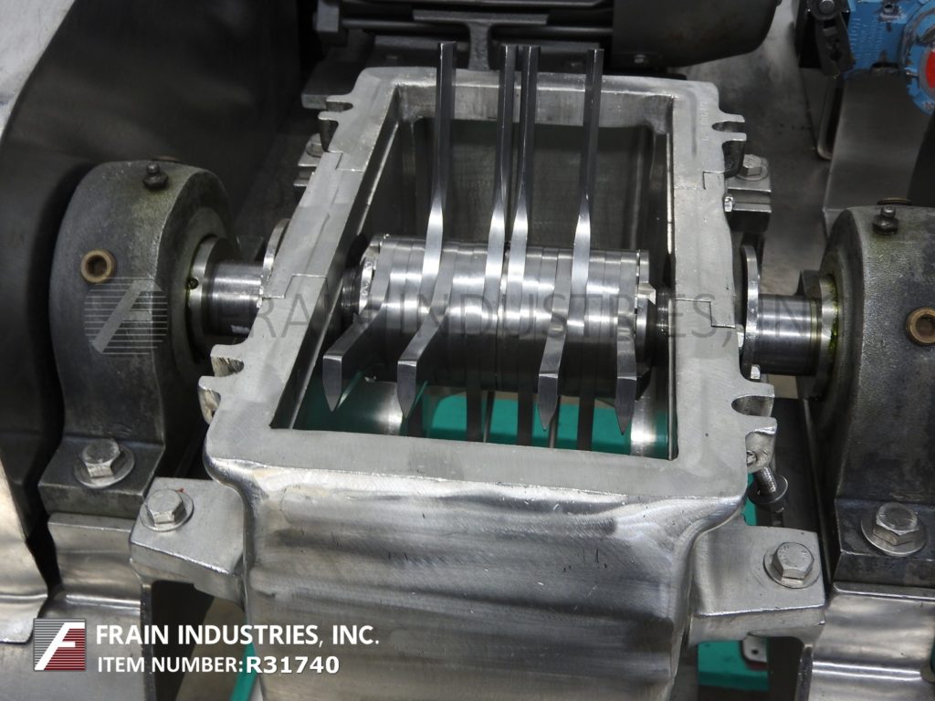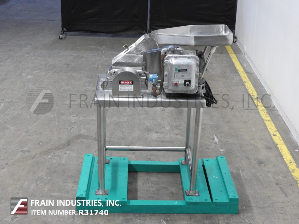 Back to All EquipmentFitzmill, Model DASO6, stainless steel hammer mill with production rates per hour – depending on materials, application and machine configuration. Equipped with 24" long x 16" wide x 4" deep feed pan and 6" x 6" feed throat with (16) fixed knife / impact blades powered by 7.5 Hp motor drive. 15” long x 6” wide product discharge with 32” floor clearance. Control panel has start, stop, reset push button controls. Mounted on (4) leg stainless steel frame.