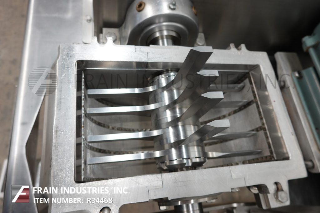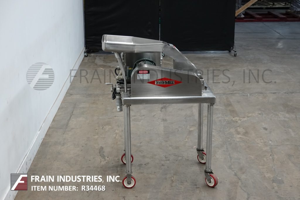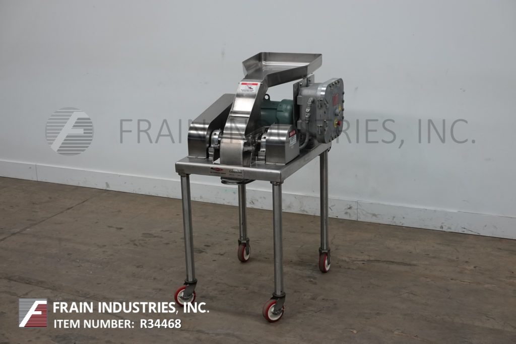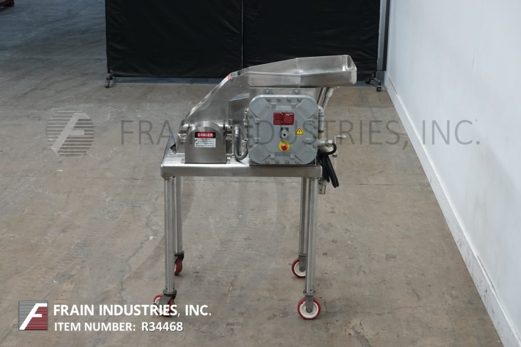 Back to All EquipmentFitzmill, Model DAS06, stainless steel hammer mill with production rates per hour – depending on materials, application and machine configuration. Equipped with 26" long x 20" wide x 4" deep feed pan, 6" wide x 4" high feed throat and (16) fixed knife/impact blades powered by 7½ Hp motor drive. Product discharge is 15½” long x 5½” wide with 36” floor clearance. Has start / stop and e-stop controls. Mounted on stainless steel (4) leg frame.