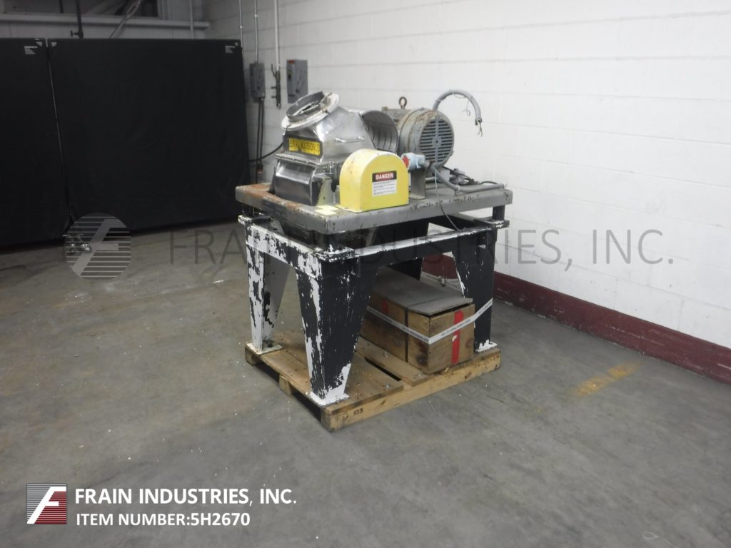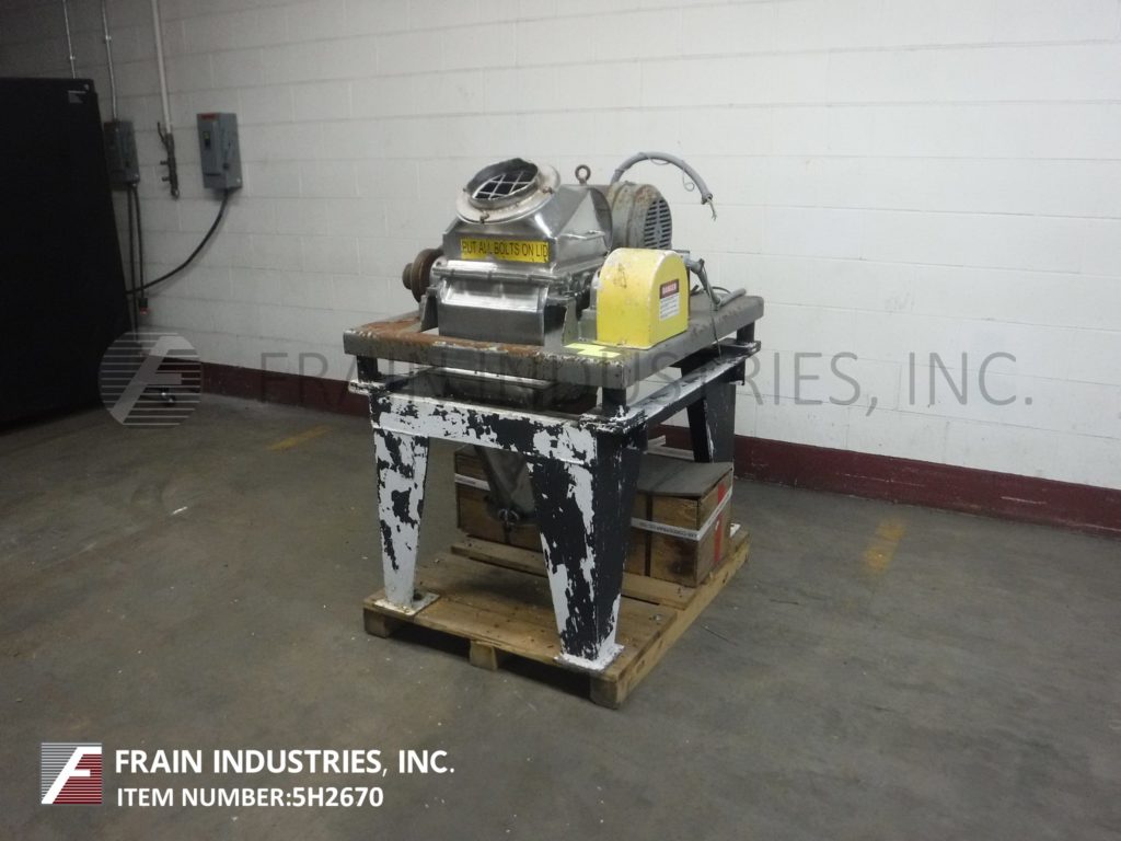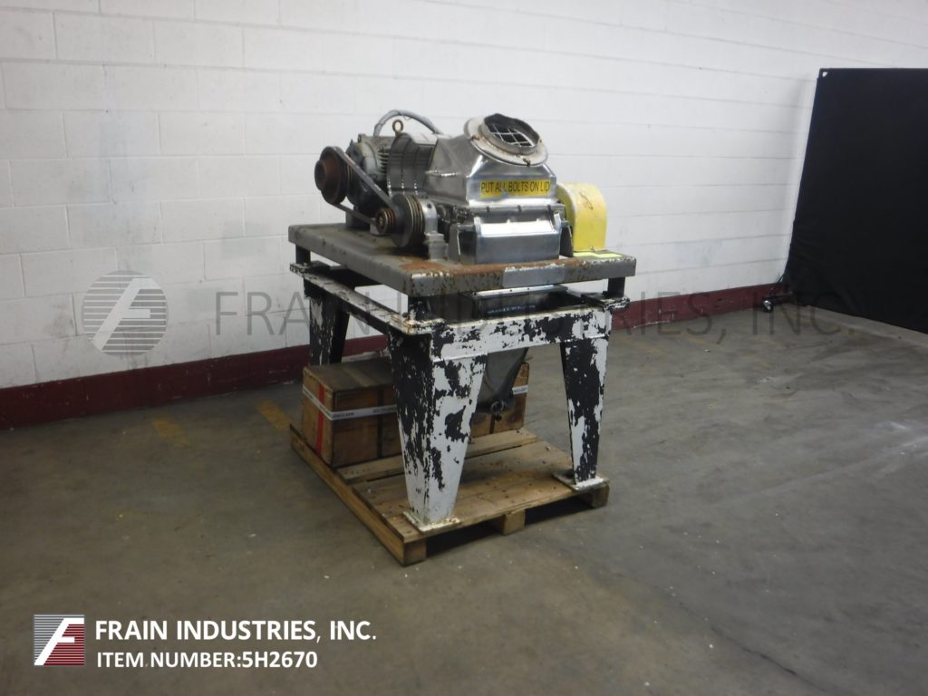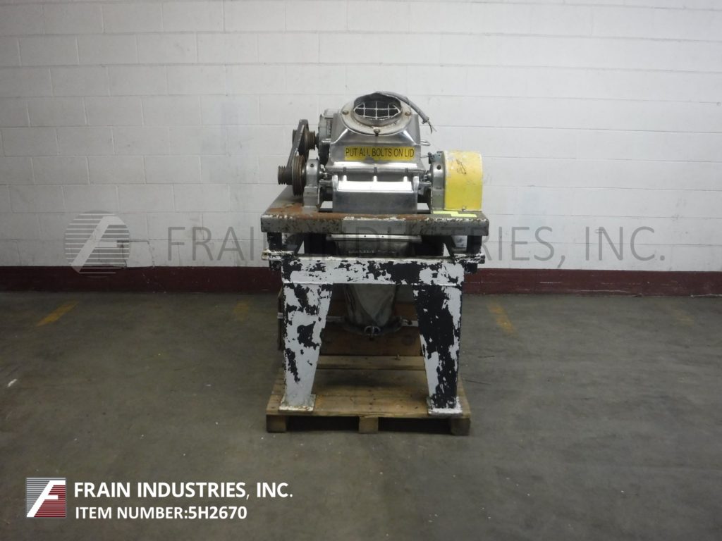 Back to All EquipmentFitzmill, Model DKAS012, hammer mill with stainless steel contact parts. Production rates per hour – depending on materials, application and machine configuration. Equipped with an 8" diameter charge port and (32) 1½" wide by 3" long fixed knife blades powered by a 15 hp drive. 11"OD / 8"ID flanged product discharge with 12” floor clearance. Mounted on a (4) leg painted base frame. Used to grind, de-lump, pulverize and process wet / dry products.