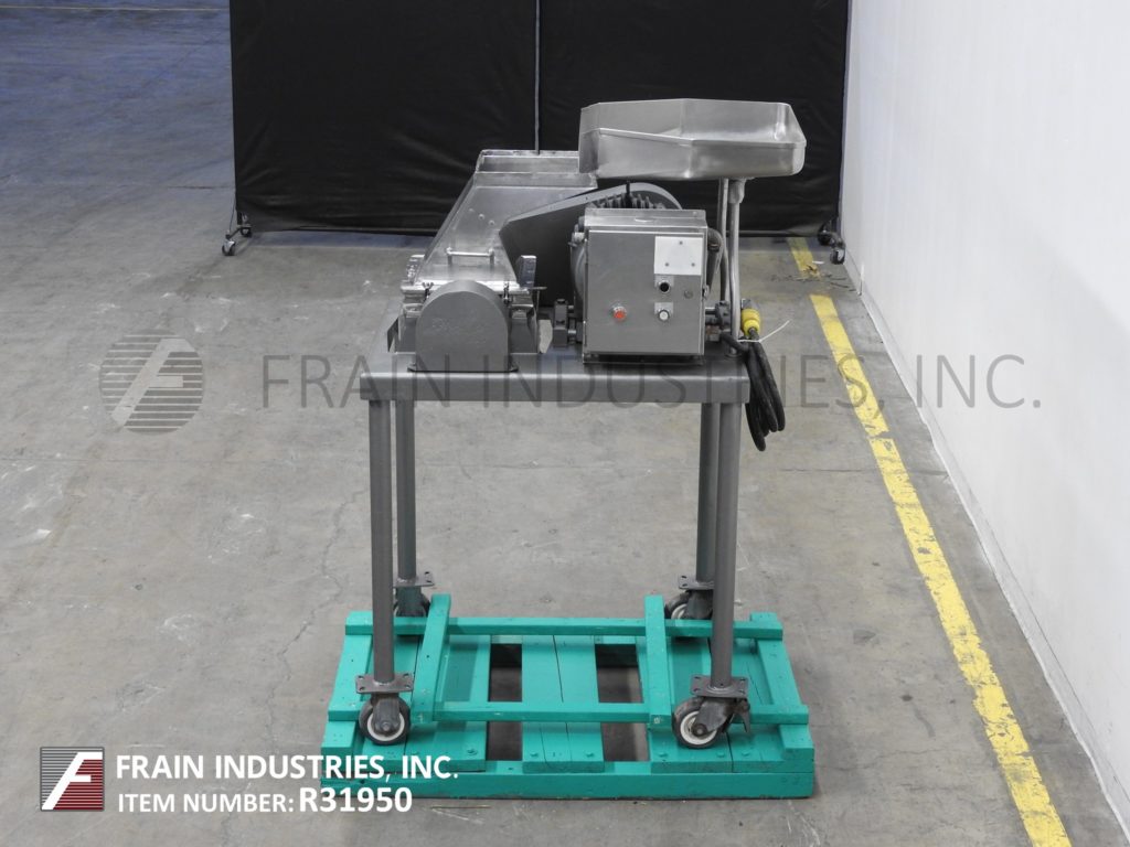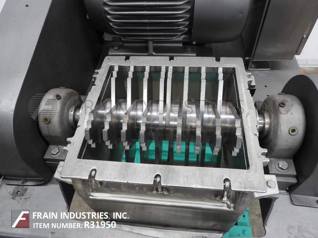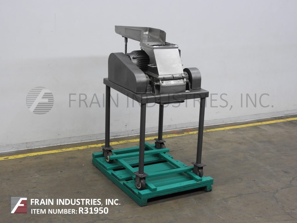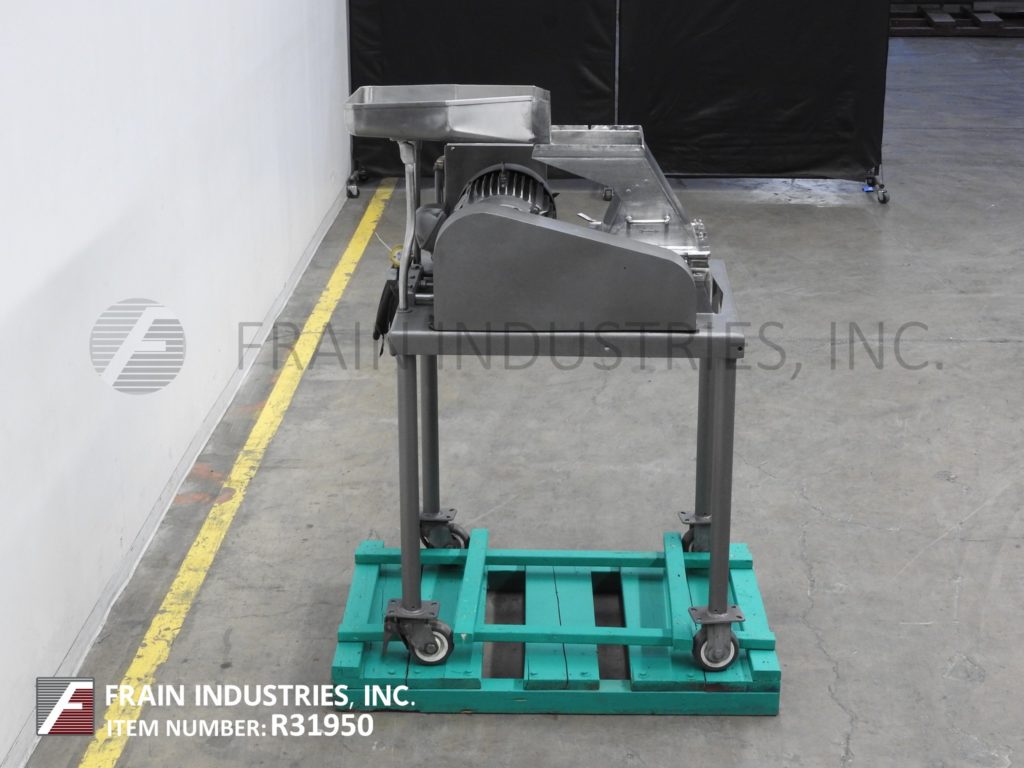 Back to All EquipmentFitzmill, Model DKAS012, stainless steel, hammer mill with pounds of product per hour – depending on materials and application. Stainless steel contact parts. Equipped with 22" long x 16" wide x 5" deep feed pan and 12" x 12" feed throat with (32) fixed impact blades and 14" x 16" discharge port with safety grid and 42" ground clearance Control panel has start, stop, e-stop push button controls and 20 Hp motor drive. Mounted on (4) leg frame with casters.