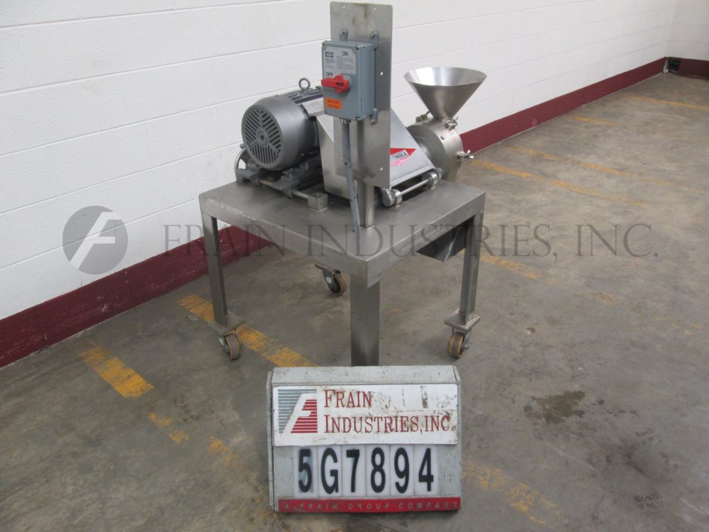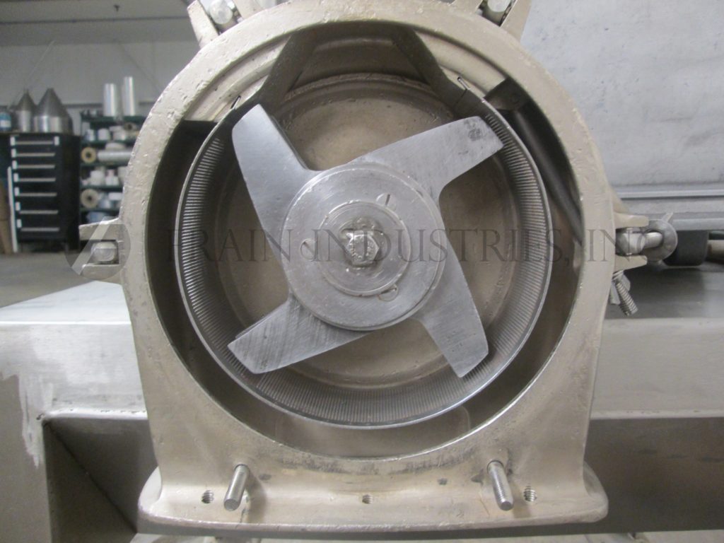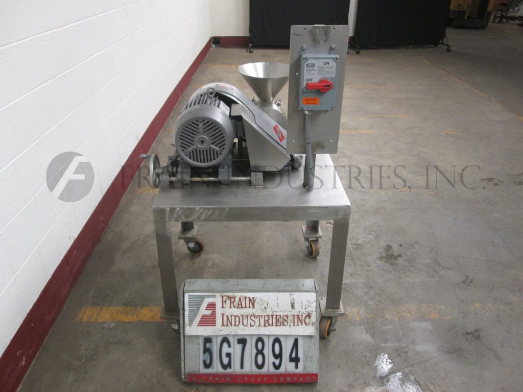 Back to All EquipmentFitzpatrick, Model JT, 304 stainless steel homoloid mill. with production rates per minute – depending on materials and application. Equipped with12" ID x 6" deep feed pan with 3" diameter product port, (12) fixed impact blades with screen area of 2½" wide x 16" long and 8" long x 2½" wide bottom product discharge with 24” ground clearance. Start, stop push button controls and mounted on a base with casters.