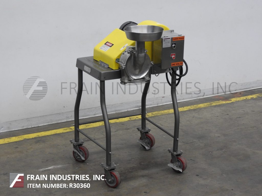 Back to All EquipmentFitzpatrick, Model JT, 316 stainless steel homoloid mill. with production rates per minute – depending on materials and application. Equipped with 12" ID x 3" deep 304 stainless steel feed pan with 2.75" ID product port, (12) swinging knife / impact blades with screen area of 2" wide x 16" long and 8" long x 2" wide bottom product discharge with 35” ground clearance. Push button start /stop controls and mounted on a base with locking casters.