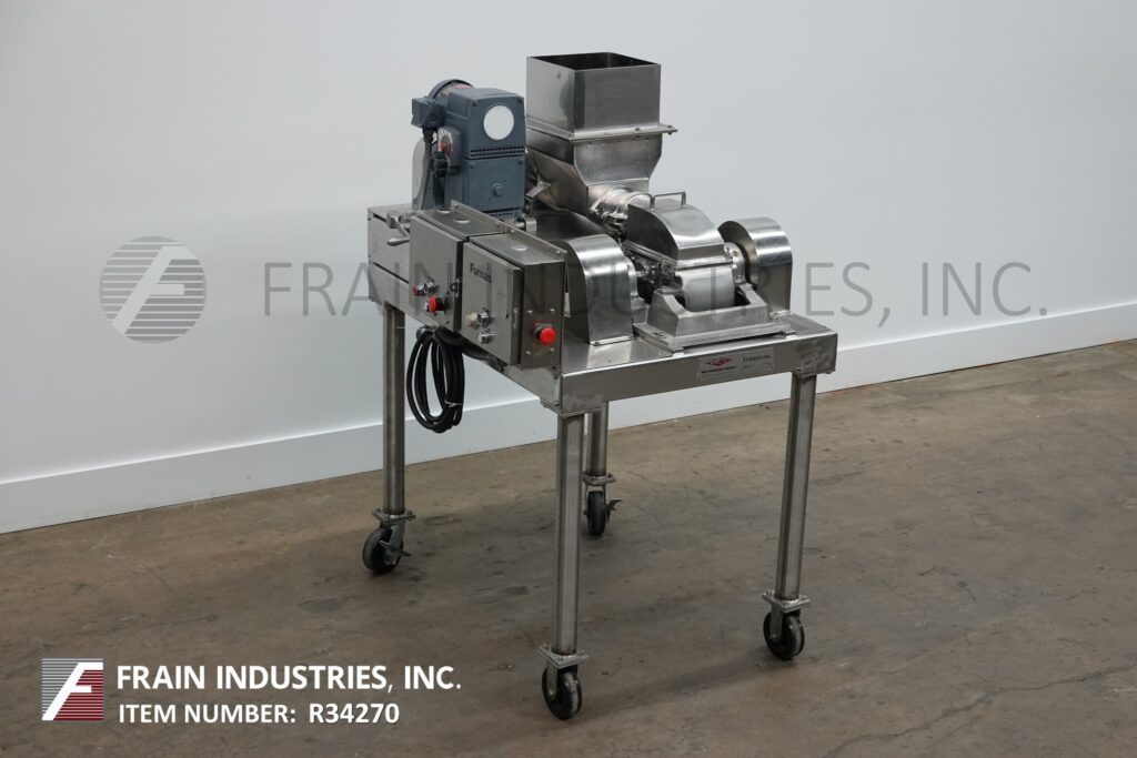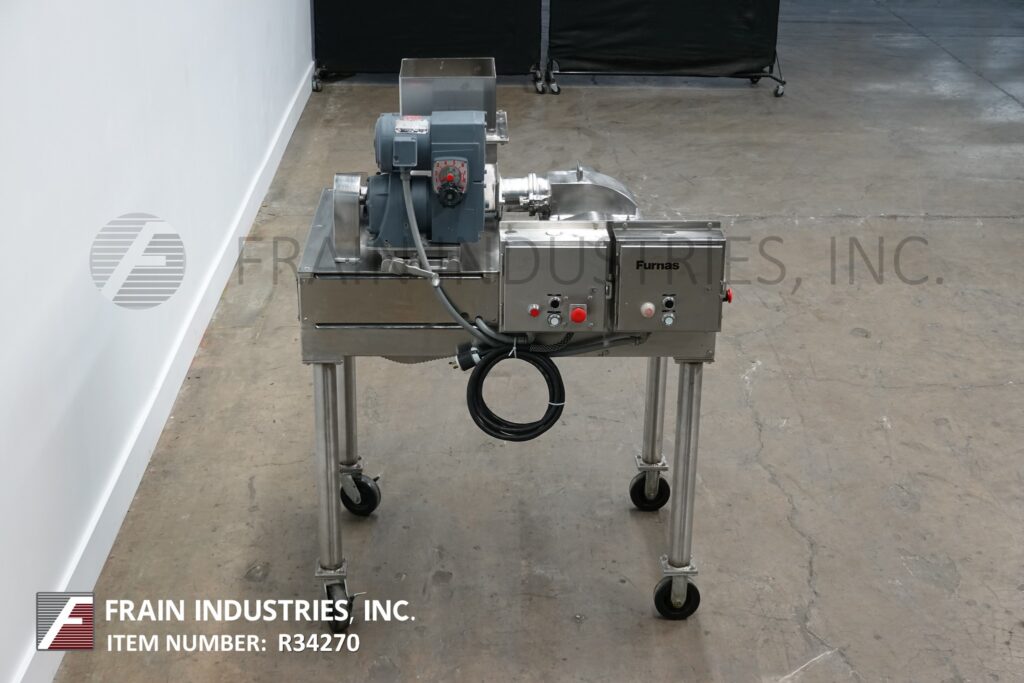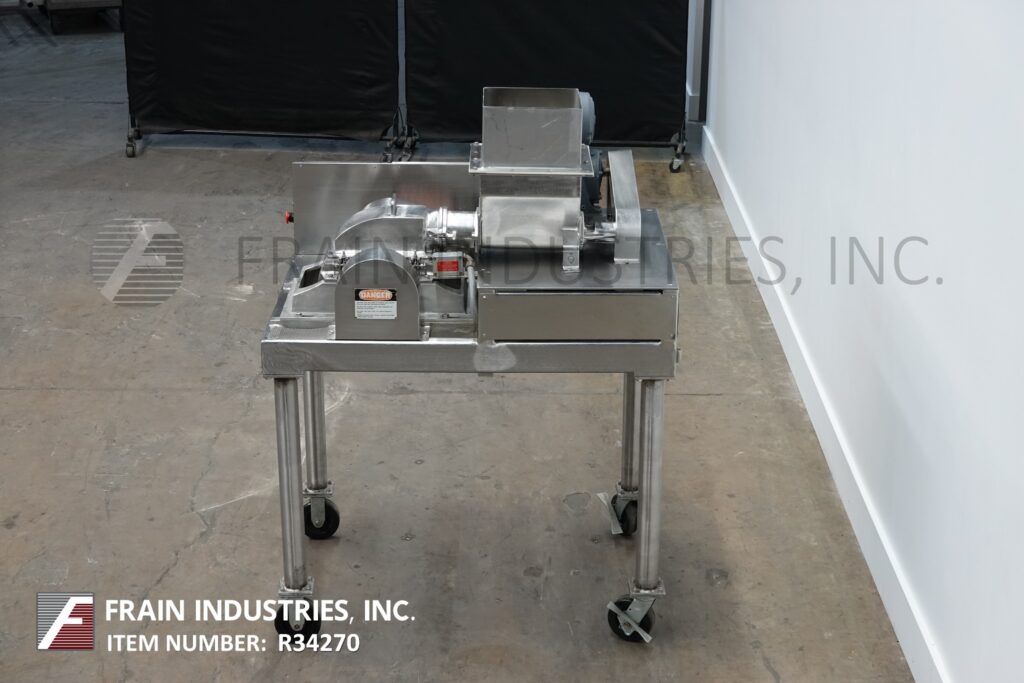 Back to All EquipmentFitzmill Model DAS06, 316 stainless steel, particle reduction, hammer mill with pounds of product per hour – depending on materials and application. Equipped with 12" long x 12" wide x 10" deep product hopper with safety grid, 4" OD x 18" long single auger feed screw powered by ¼ Hp motor drive with variable speed gearbox, (16) fixed, reversible stainless steel knife / impact blades driven by 10 Hp motor drive and has 15" long x 6" wide product discharge port with safety grid and 36" floor clearance. Mounted on stainless steel frame with locking casters.