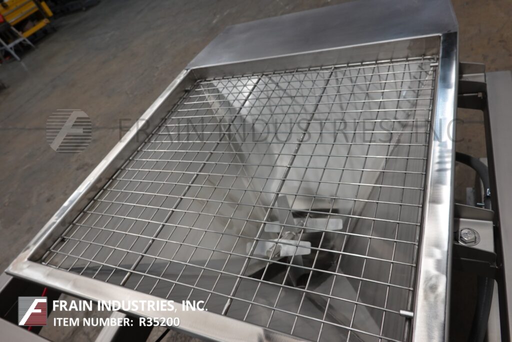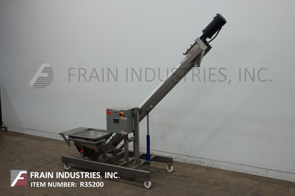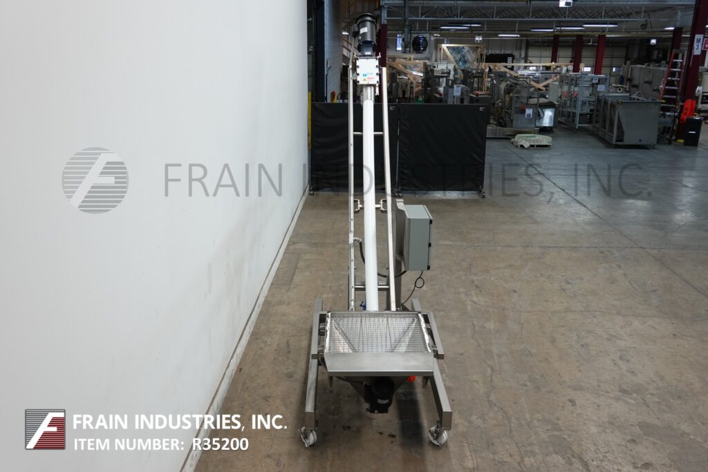 Back to All EquipmentFlexicon, Model 1450, Rated up to 140 ft³ of product per hour – depending on materials, application and product density. Equipped with 30” long x 30” wide x 24” deep stainless steel agitated product hopper and cover with ½ Hp agitator drive, and mounted on (4) legs, with 3" OD x 151" long stainless steel product conveying screw, 4" OD x 120" long flexible poly tube and has top mounted 3 Hp motor drive with 6” ID product discharge port Control panel has start, stop, e-stop controls. Mounted on stainless steel Model PB1-S-X Portable base with support mast and has (2) 6" swivel casters with brake under hopper and (2) 6" rigid casters with extended length base and Tilt-Down support mast with manually actuated hydraulic jack.